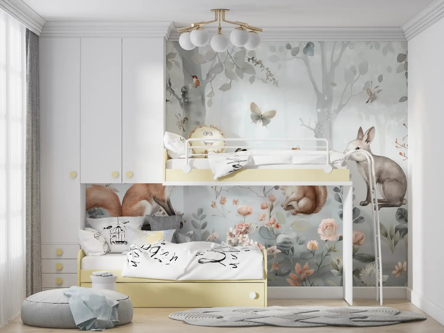 Evoke warm forest friendship with the "Children's Wallpaper - Glade Companions." Rabbits, foxes, small deer, and birds share a clearing bathed in light. The high-quality print enhances the brightness of the fur and the tranquility of the decor. An enchanting choice to energize the bedroom, while inspiring respect for wildlife and nature.