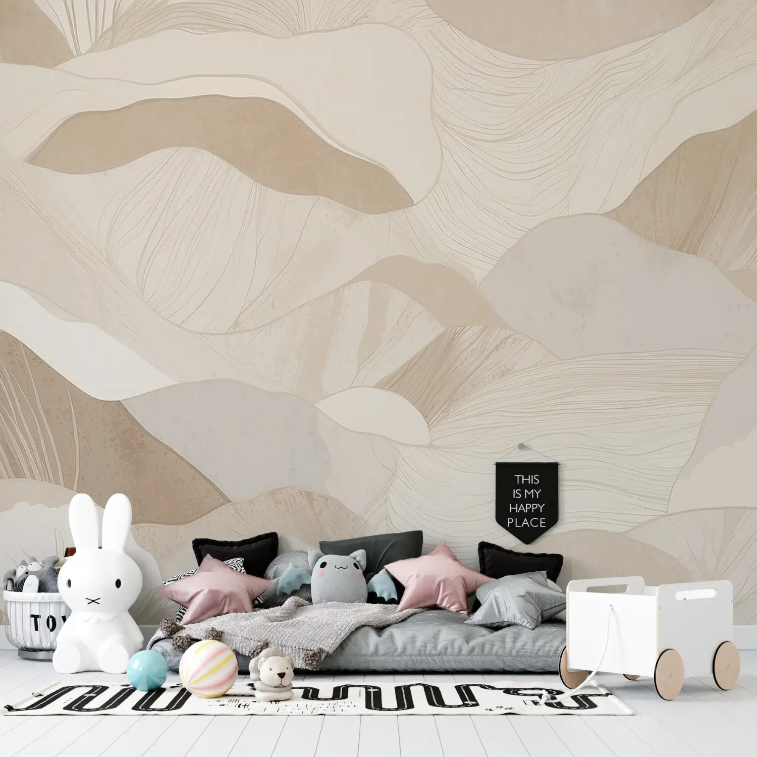 Explore sandy waves, combining beige, ochre, and brown hues into sinuous shapes. The subtle print evokes the softness of a desert or the delicacy of soothing dunes. A decor that exudes warmth and serenity, inviting relaxation and the reverie of infinity.