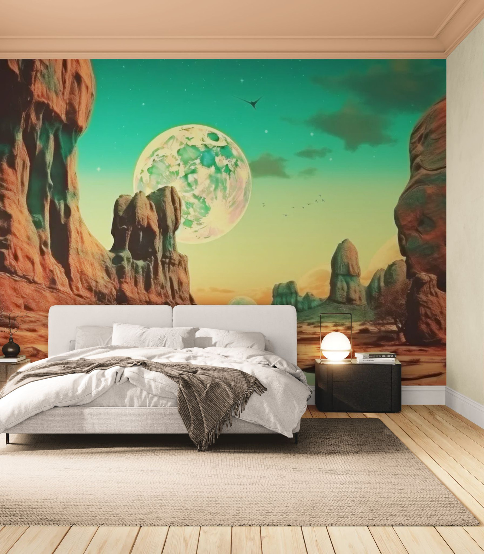 Discover emerald dunes sculpted by alien winds beneath a futuristic sky of otherworldly hues. This premium wallpaper offers total immersion in a majestic science-fiction world. Perfect for a modern living room, a visionary office, or a game room.