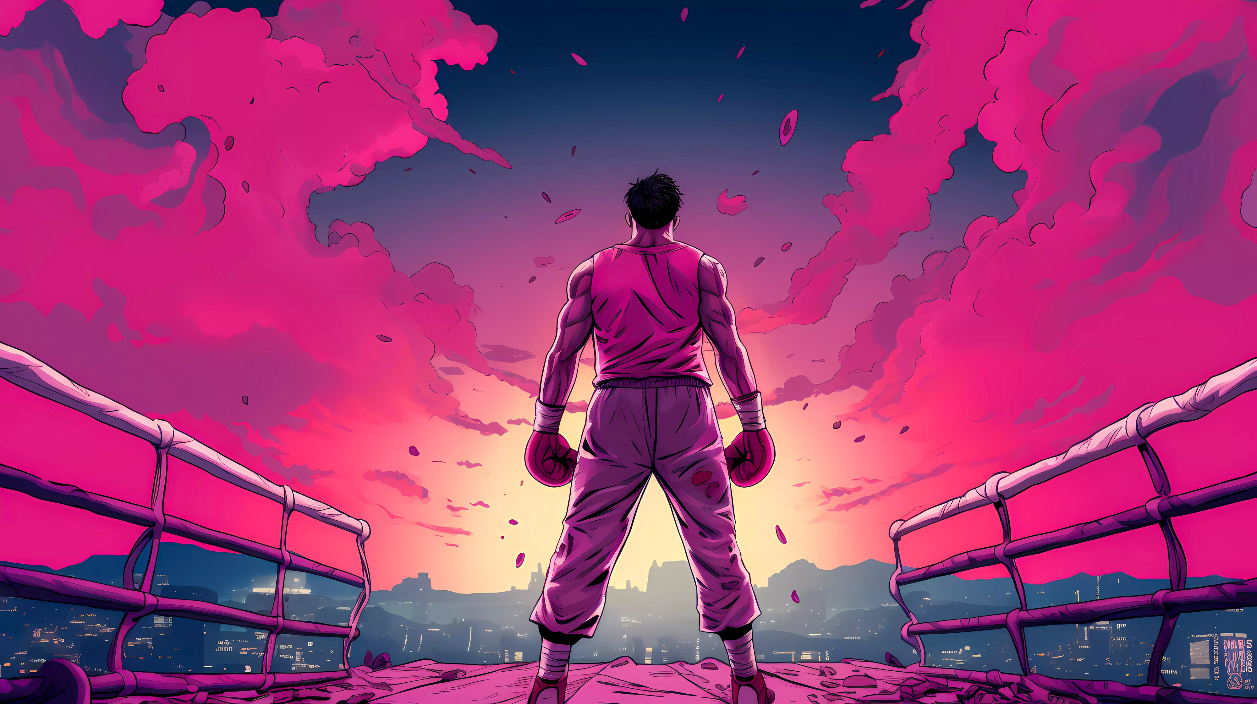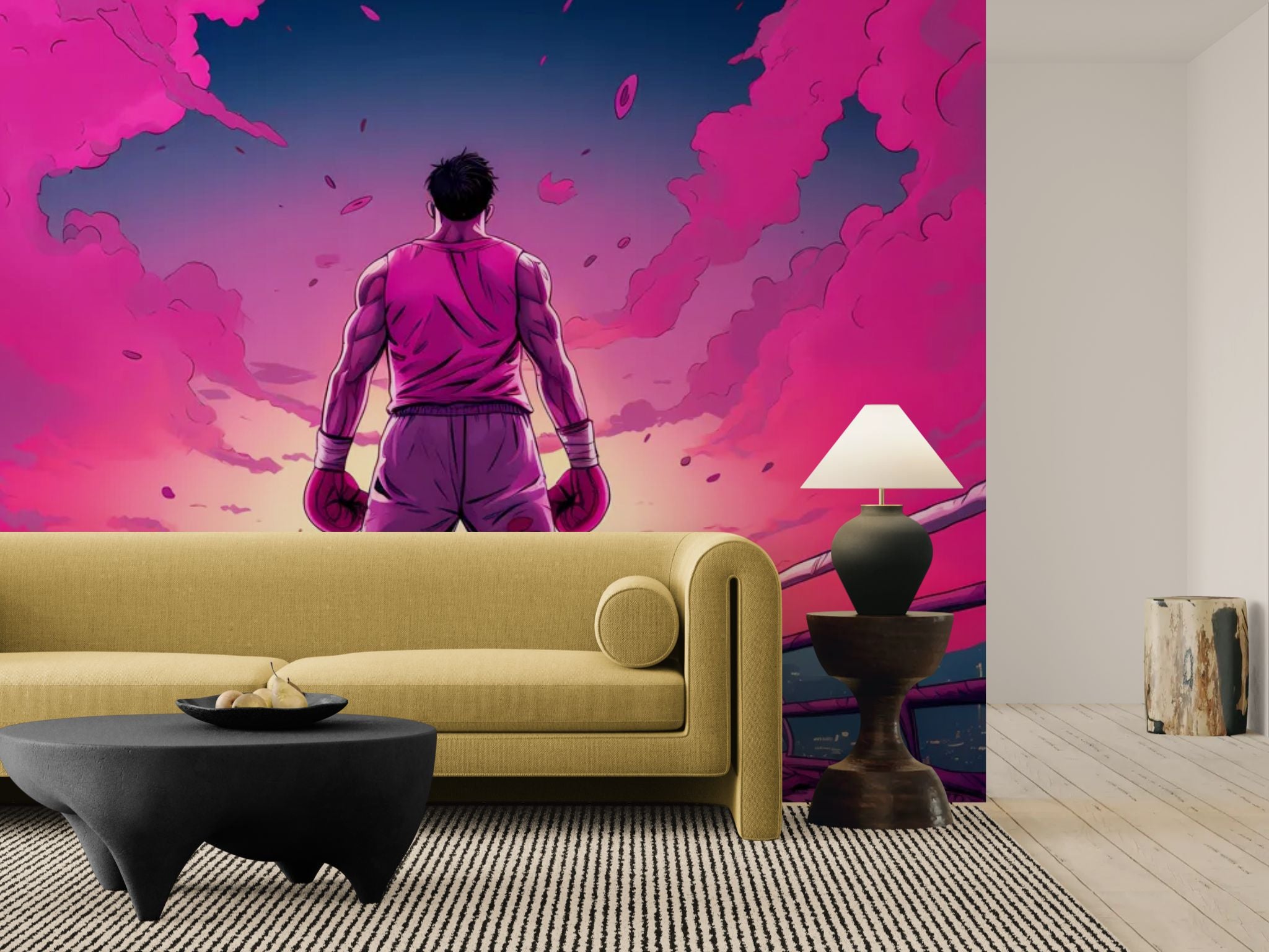 A boxer stands before an emotionally charged twilight horizon. The scene conveys inner strength and determination. Ideal for an inspiring and powerful interior. The contrasts of light enhance the intensity of the image. A highly symbolic wall piece.