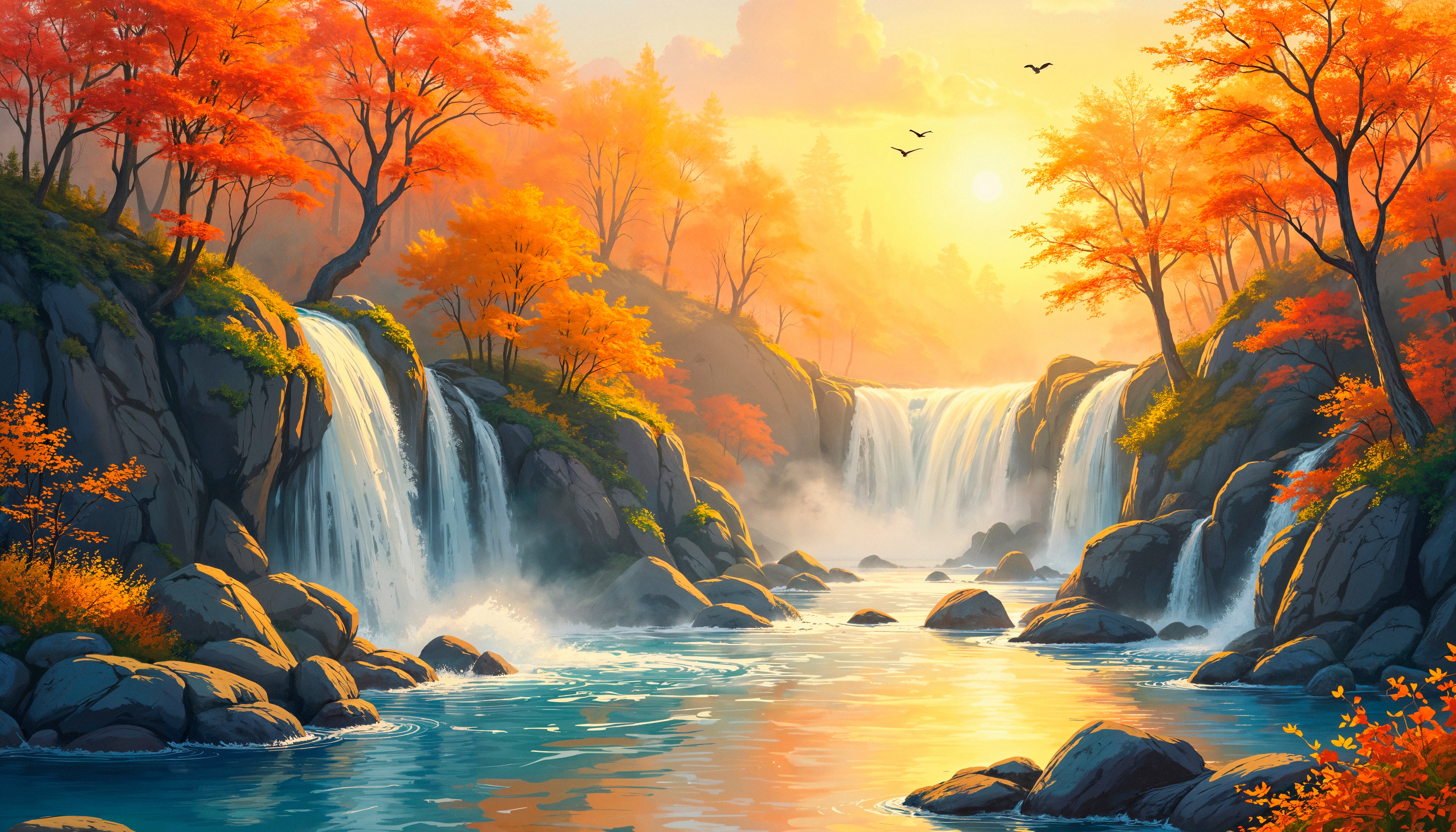 The majesty of autumn in panoramic format. Invite the wild into your home with this landscape wallpaper . The spectacle of cascading waterfalls in the heart of a golden autumn forest bathes the room in a warm light. This high-definition trompe-l'œil captures the richness of textures and the vibrancy of colors, creating an immediate sense of spaciousness. A majestic mural to enhance a living room with organic elegance.