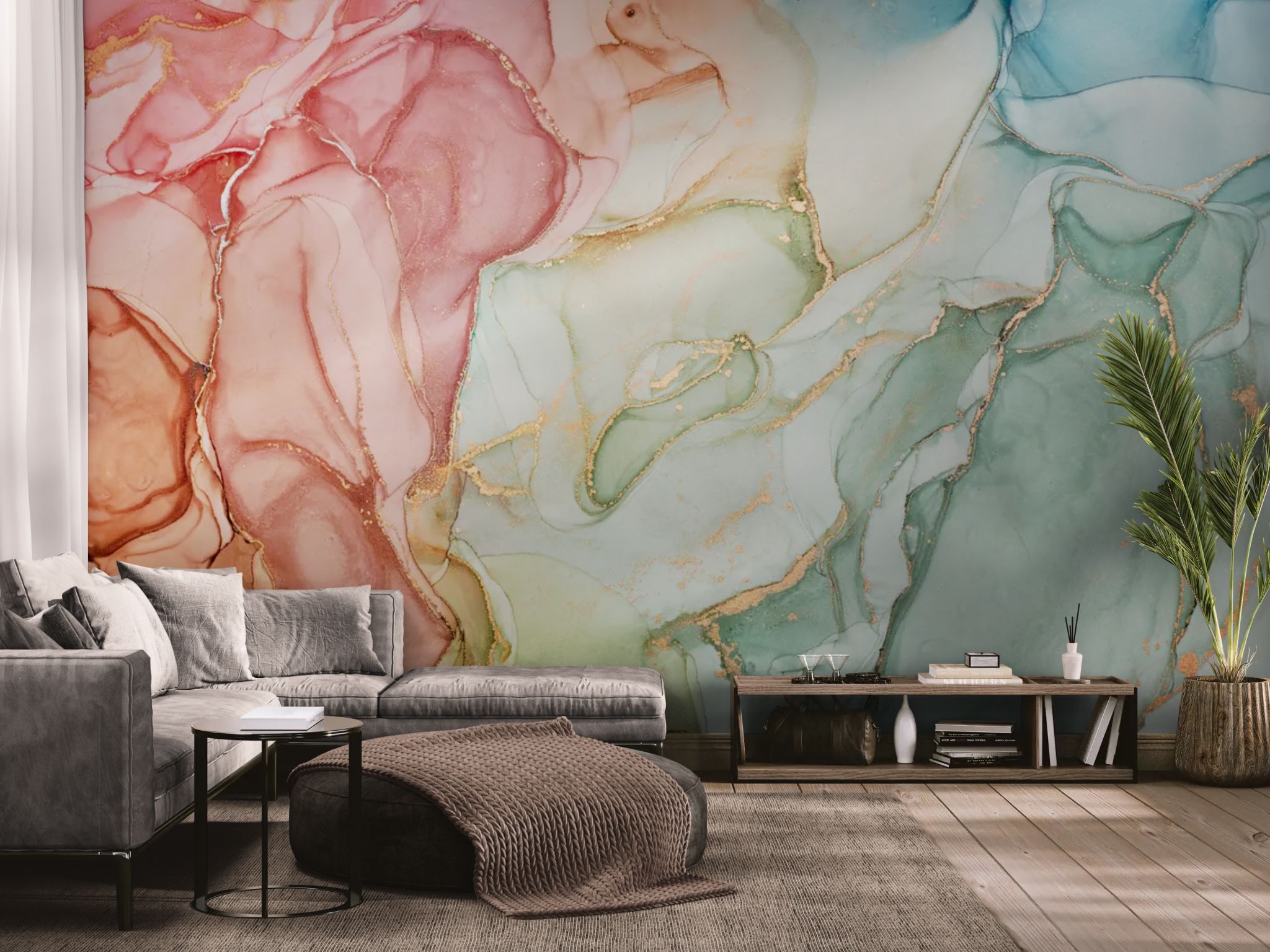 Artistic delicacy and jewel-like lines. Bring sophisticated femininity to your décor with this abstract wallpaper . Swirls of pastel inks mingle with fine gold lines , creating an airy and graceful composition. This fluid design evokes the lightness of watercolor and the luxury of gilding. Ideal for a romantic bedroom or an elegant boudoir.
