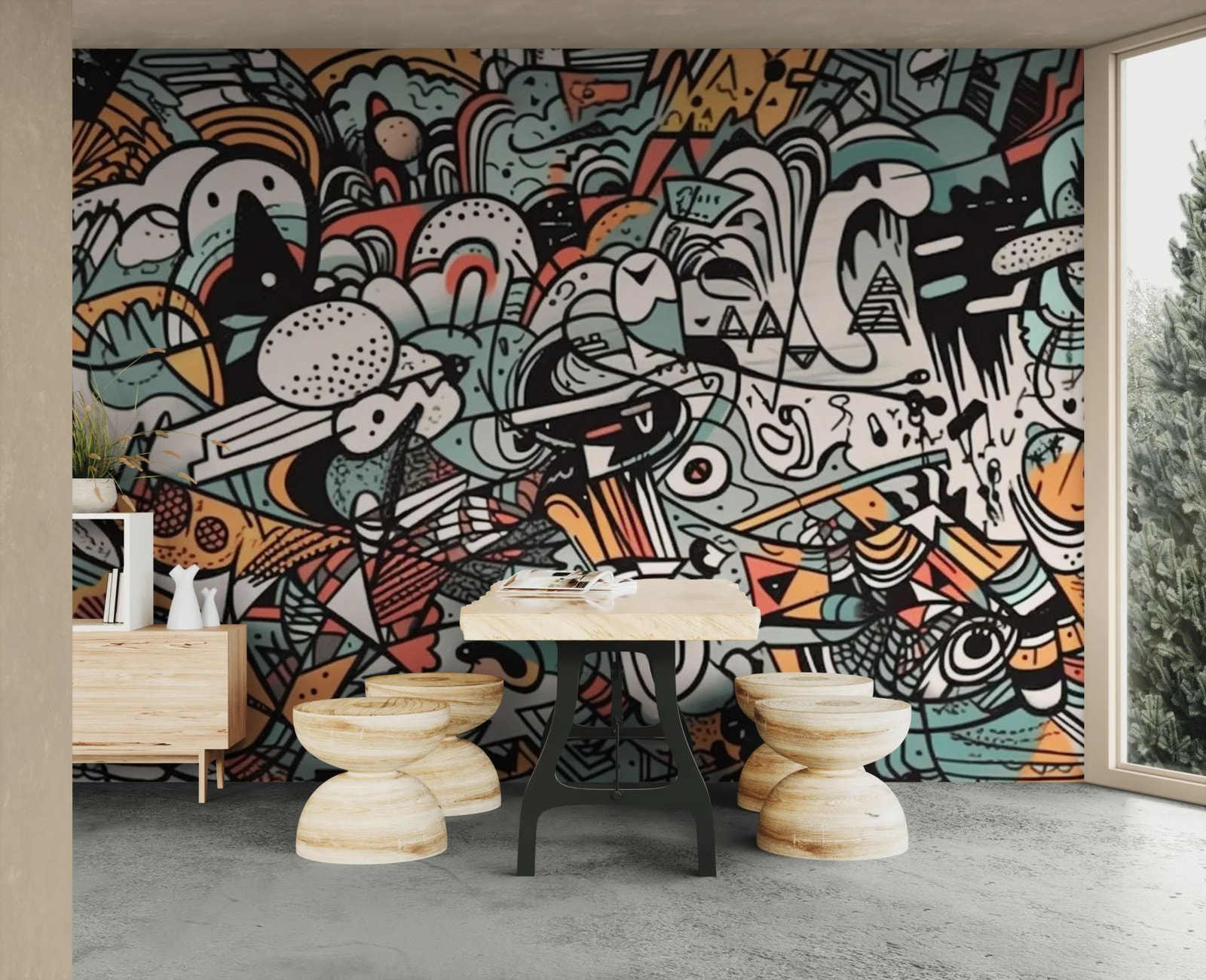 A contemporary graphic mural transforms the wall into a work of art. Bold lines create movement and depth. Ideal for a modern and creative interior. The composition powerfully captures the eye. A decidedly contemporary decorative statement.