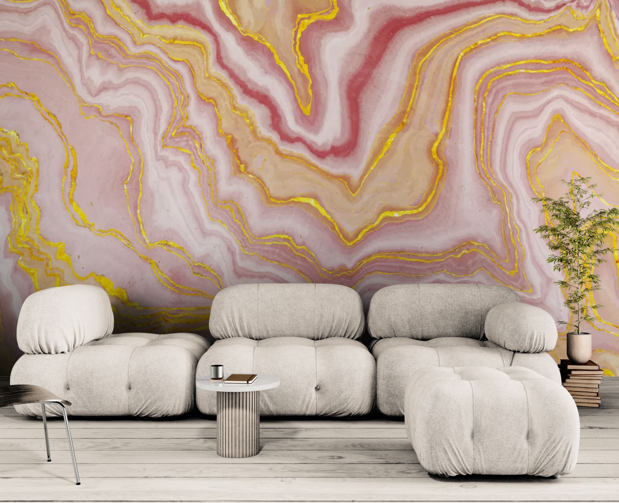 The contemporary elegance of pink marble. Enhance your interior with this liquid marble effect wallpaper . Swirls of powder pink and golden veins create an incredibly rich visual texture. This wallcovering brings a touch of warm luxury, ideal for a feminine living room or master suite. A statement piece combining mineral strength and soft hues for a Soft Luxury ambiance.