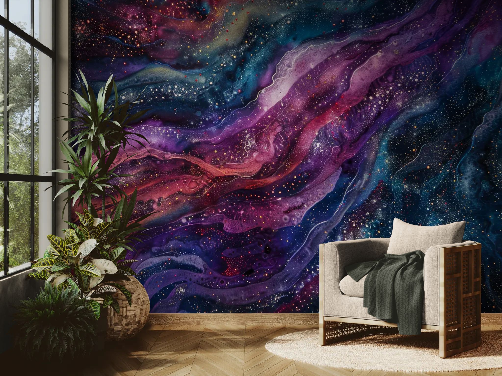 Immerse yourself in chromatic depth. Give your room a mysterious and sophisticated dimension with this abstract wallpaper . The movement of a cosmic wave , saturated with deep pigments (abyssal blue, violet, indigo), creates a hypnotic visual texture. This powerful design brings character and contemporary elegance. Ideal for dramatizing a living room, entryway, or TV wall with an intense and luxurious artistic touch.