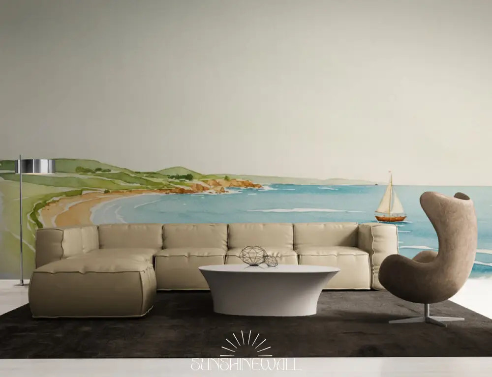 Transport yourself to the endless horizon of a seaside with the "Watercolor - Beach and Boat" wallpaper. Its pastel hues, applied in delicate veils, recreate the sensation of the sea breeze caressing a coastal landscape. The small boat silhouetted offshore suggests a gentle adventure, reinforcing this feeling of calm and freedom. Created with premium inks and a durable backing, this wallpaper guarantees easy installation and excellent durability. Perfect for adding depth to a wall, it creates a corner of perpetual vacation in a living room or bedroom, inviting dreams and relaxation.
