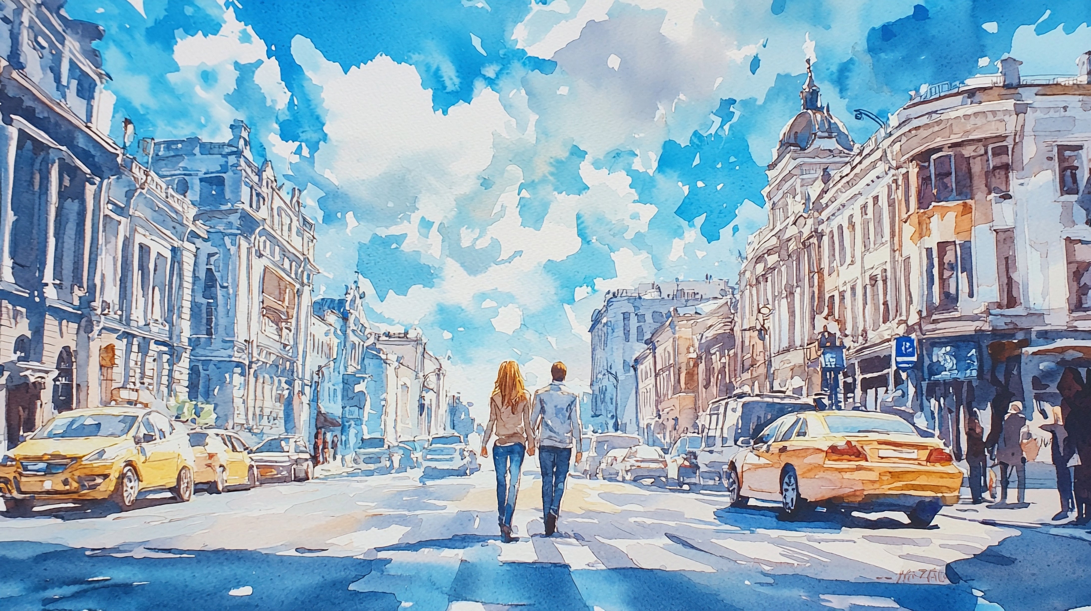 The vibrant energy of the city in soft colors. Brighten your walls with the lightness of this watercolor wallpaper . The urban street scene , bathed in sunlight , is rendered with fluid and vibrant artistic touches. This design captures the positive energy of city life while maintaining a poetic softness thanks to the water-based technique. Perfect for energizing a kitchen or entryway with a touch of warm, contemporary art.