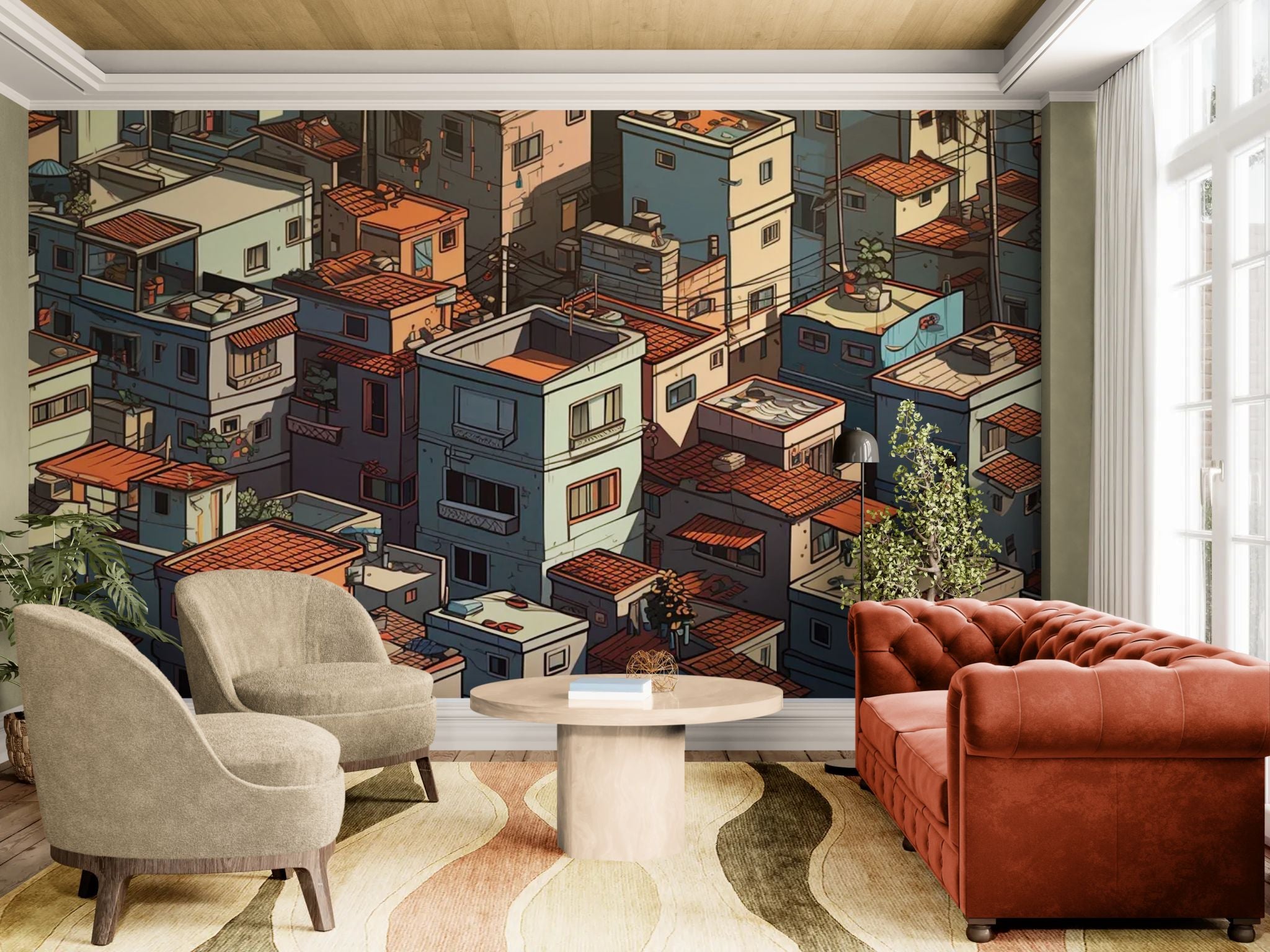 Urban and picturesque charm. Add depth to your walls with this colorful architectural wallpaper . The jumble of stacked houses with tiled roofs creates a dense and inviting visual pattern, reminiscent of Mediterranean villages or artistic favelas. This vibrant design brings texture and a welcoming energy to a kitchen or hallway. An urban mosaic that celebrates life and color with authenticity.