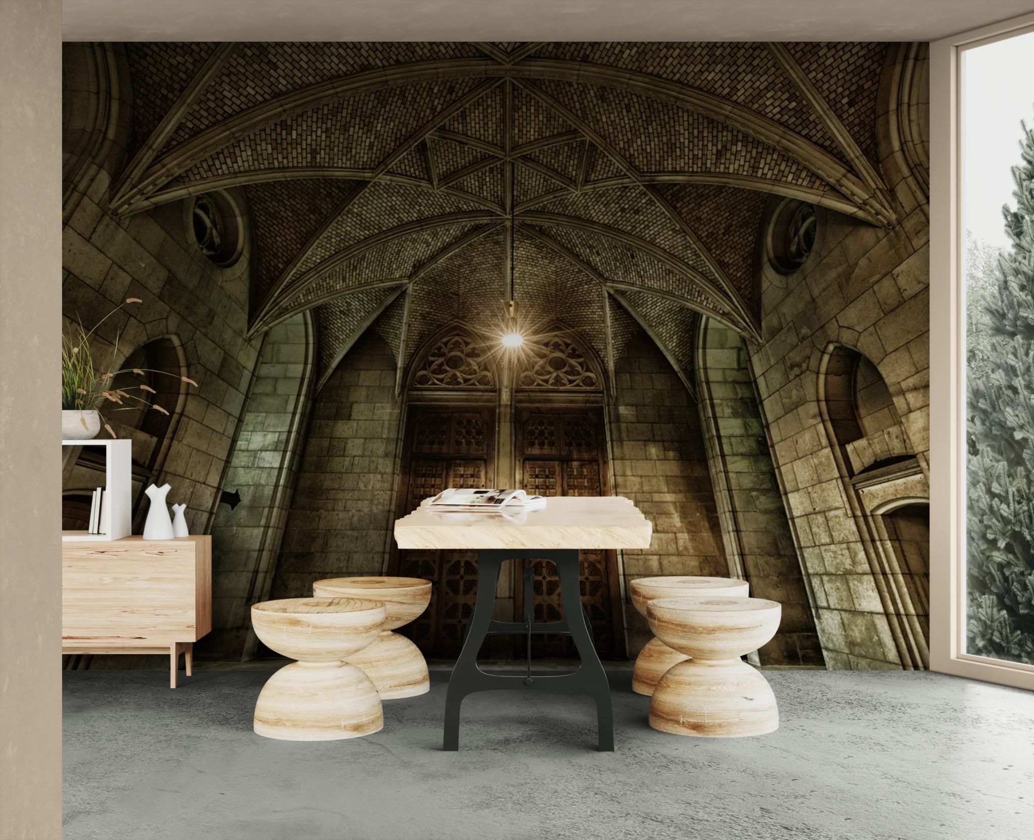 The grandeur of architectural history. Elevate your interior with this architectural wallpaper . The perspective of a monumental Gothic stone vault offers incredible depth and nobility. The details of the arches and the filtered light create a solemn and grandiose atmosphere. Perfect for visually widening a hallway or adding character to a classic living room.