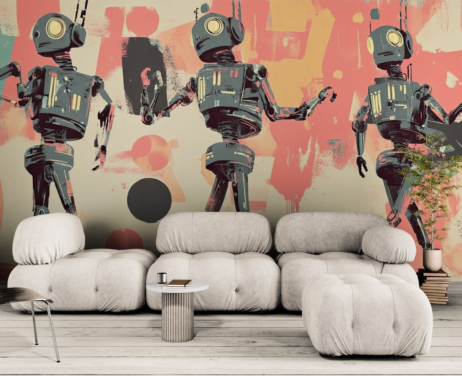A touch of pop and colorful nostalgia. Liven up your walls with this artistic wallpaper featuring three retro robots . The vintage design of the characters contrasts dynamically with a vibrant, colorful background , creating a joyful and quirky piece. Perfect for a creative office, a teen's bedroom, or an industrial-style living room, this design blends the imagination of classic science fiction with contemporary graphic execution. A striking piece that instantly brings character and cheer.