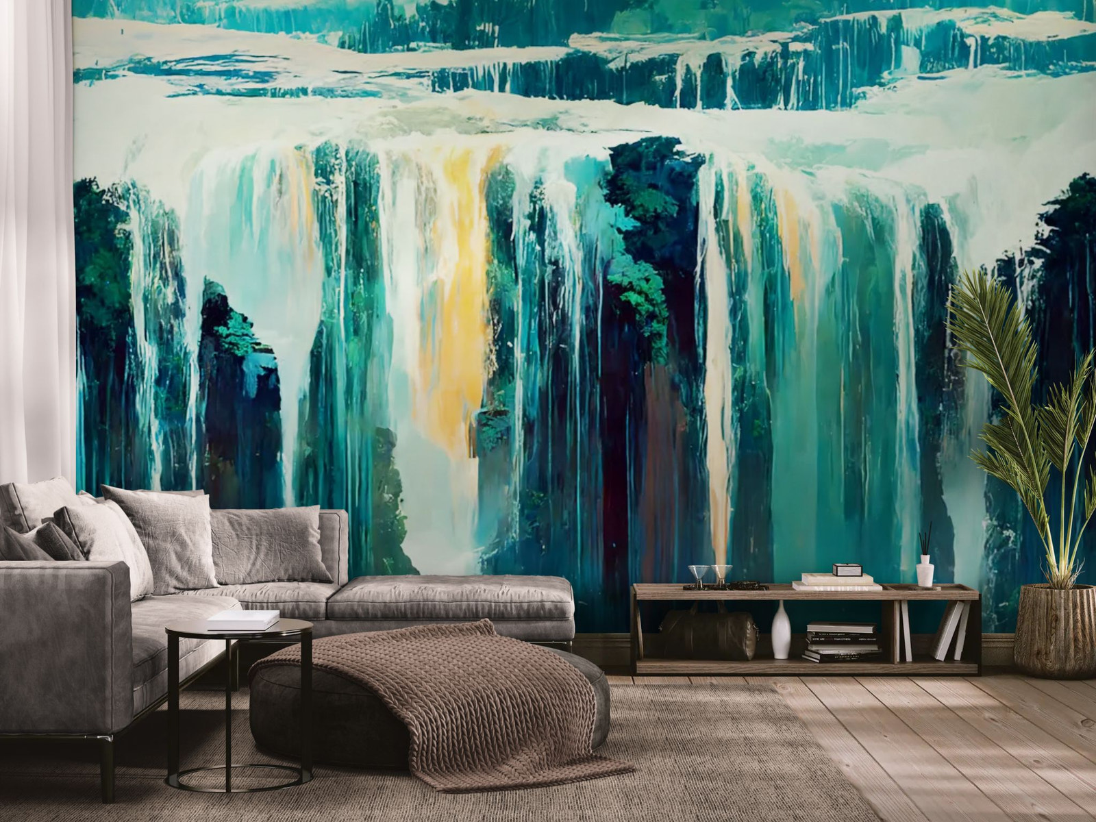 Digital art in service of nature. Transform your wall into a living painting with this artistic wallpaper . The poetic waterfall , reinterpreted as a digital painting , offers unique textures and vibrant colors. This design, blurring the lines between reality and imagination, brings a touch of creative modernity. Perfect for digital art enthusiasts seeking a zen and contemporary atmosphere.