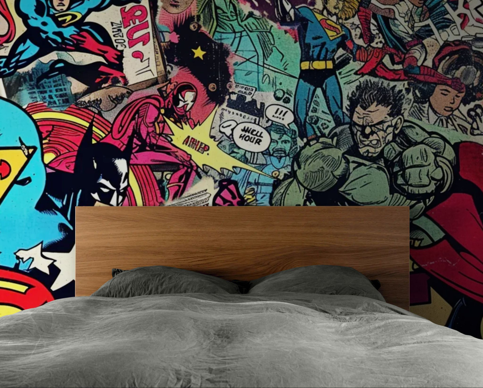 Action and justice in a big way. Embody the power with this superhero wallpaper . The illustration of a retro -style vigilante, cape billowing and muscles bulging, brings a dynamic, positive energy to the room. The vibrant colors and classic lines are reminiscent of collectible magazine covers. A must-have for a child's bedroom, a gaming room , or for die-hard comic book fans.