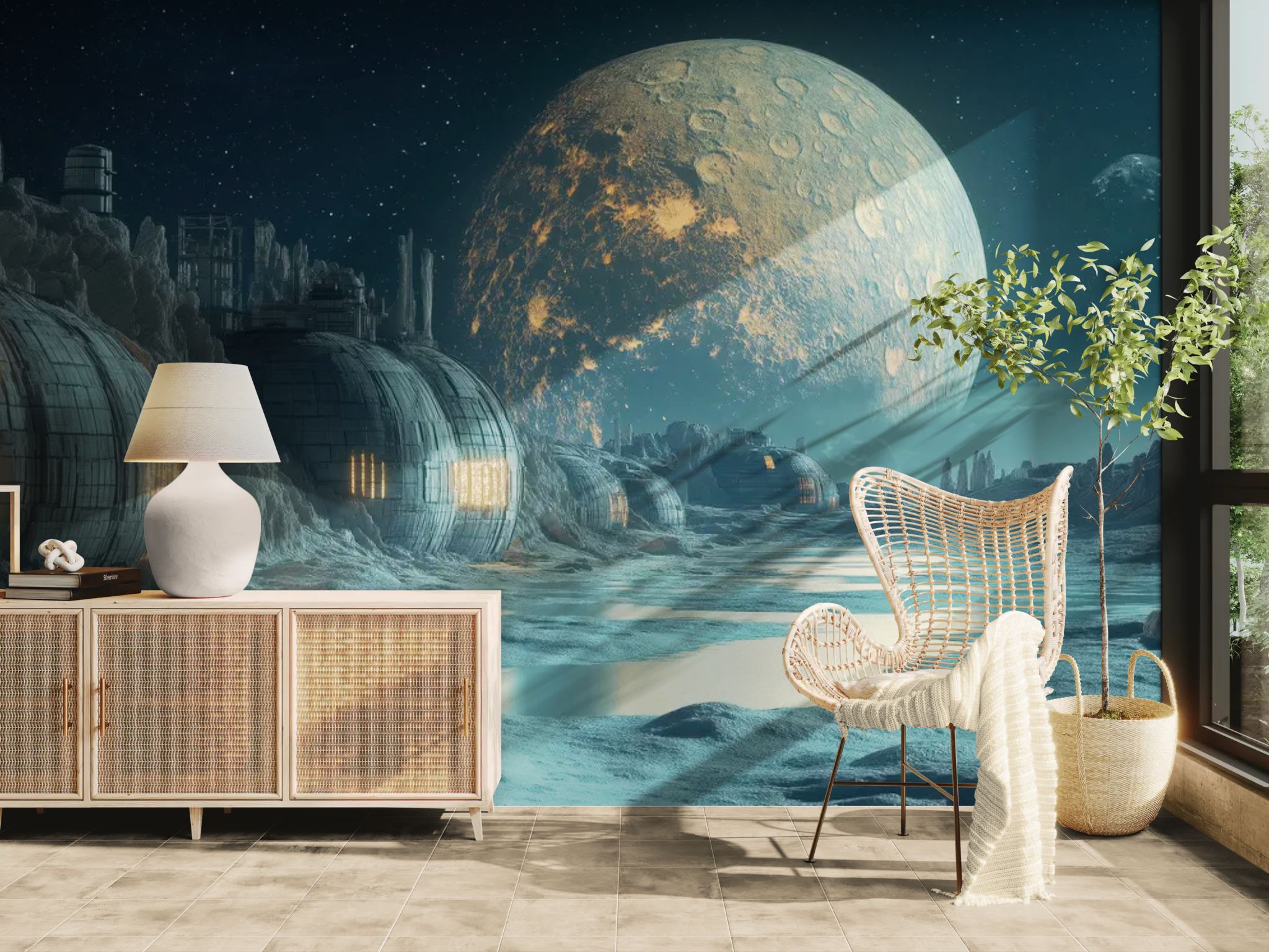 Humanity's Outpost. Inspire exploration with this science-fiction wallpaper . The detailed view of a futuristic lunar base , with its domes and rovers on the gray ground, propels your décor into the realm of space conquest. This sleek, technological design is perfect for an office, an astronomy enthusiast's bedroom, or a high-tech space.