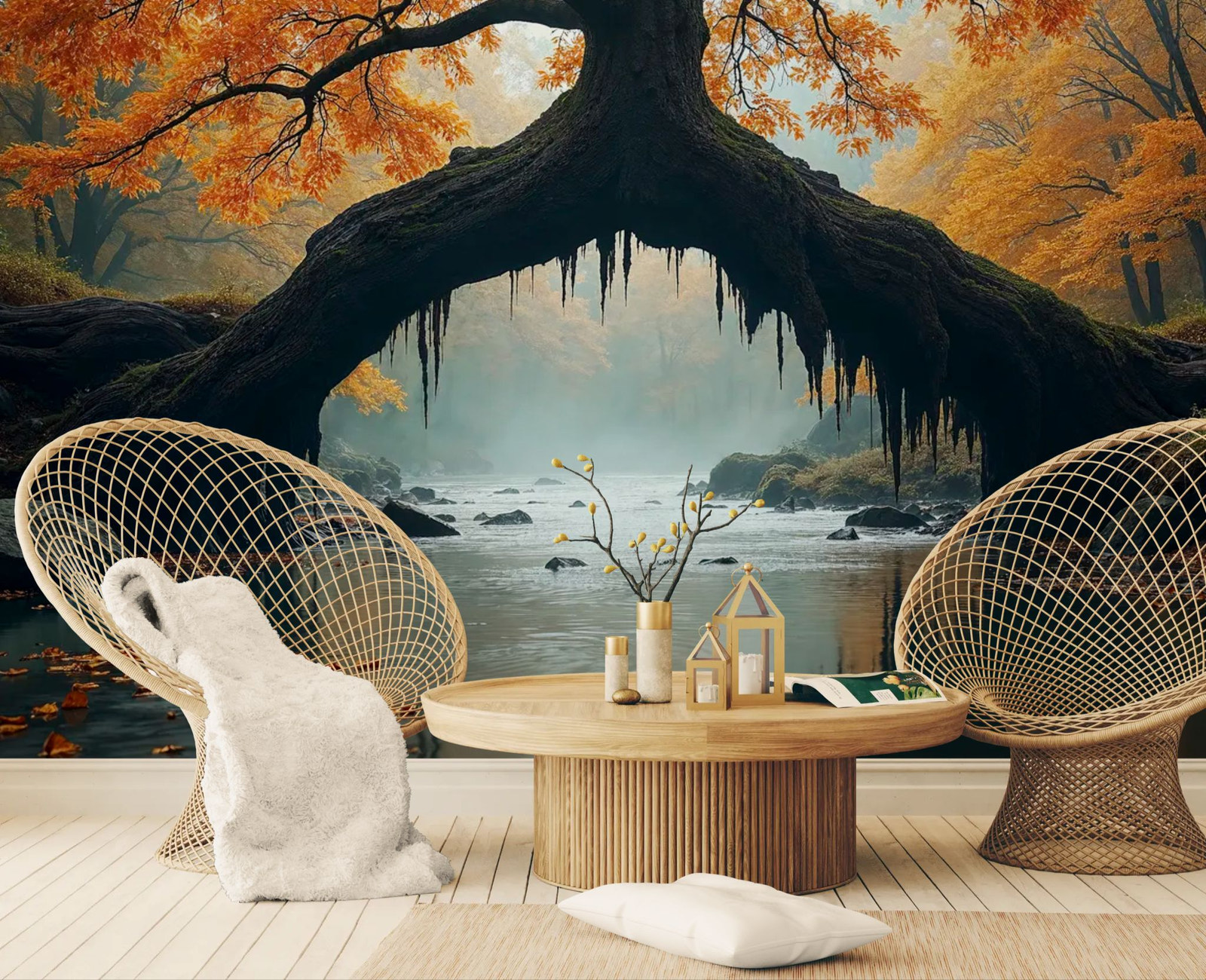 The secret passage to another world. Embrace the mystery with this whimsical wallpaper . The imposing mystical tree , whose roots and branches form a natural arch , invites you to cross the threshold into reality. This captivating design, rich in detail, creates a dark and elegant fairytale atmosphere. A centerpiece for a library or reading nook.