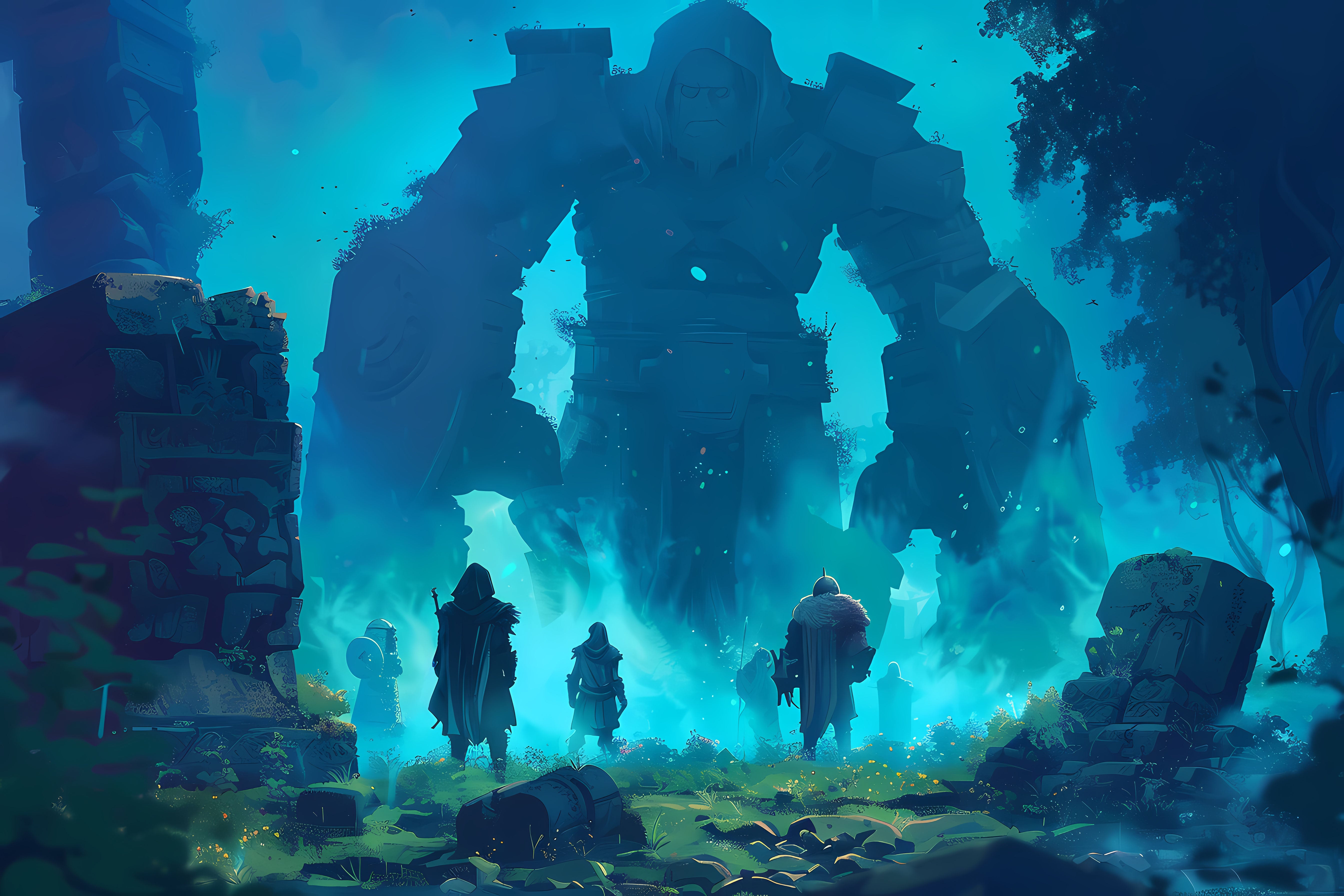 Un géant de pierre oublié se dresse parmi les vestiges d’un ancien royaume. Une atmosphère épique et mystérieuse, parfaite pour une salle dédiée aux mondes imaginaires, un bureau ou une chambre héroïque.