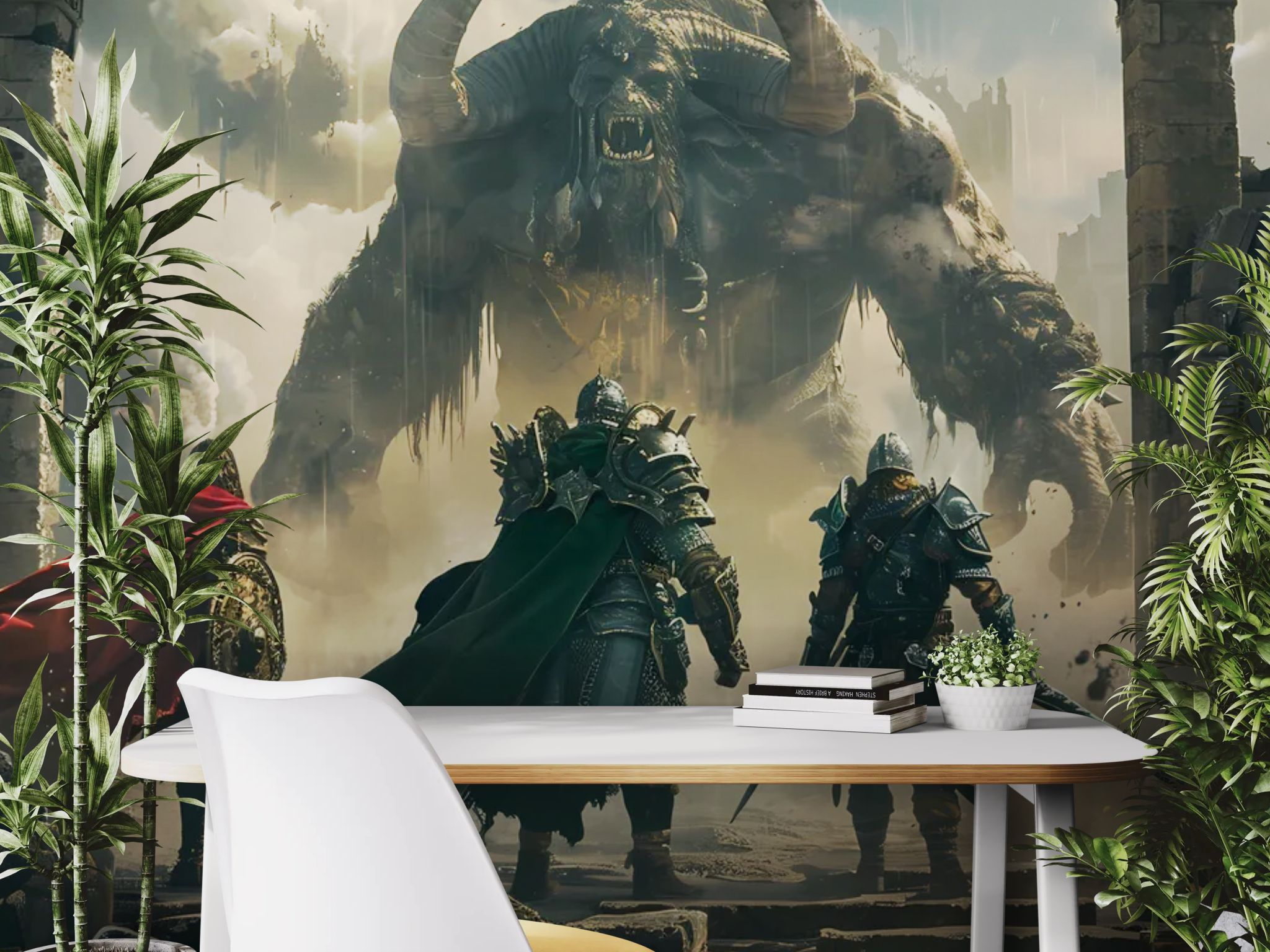 Un géant de pierre se redresse au milieu d’un ancien royaume effondré. Décor épique et mystérieux, idéal pour un salon grandiose, une salle gaming ou une bibliothèque fantastique.