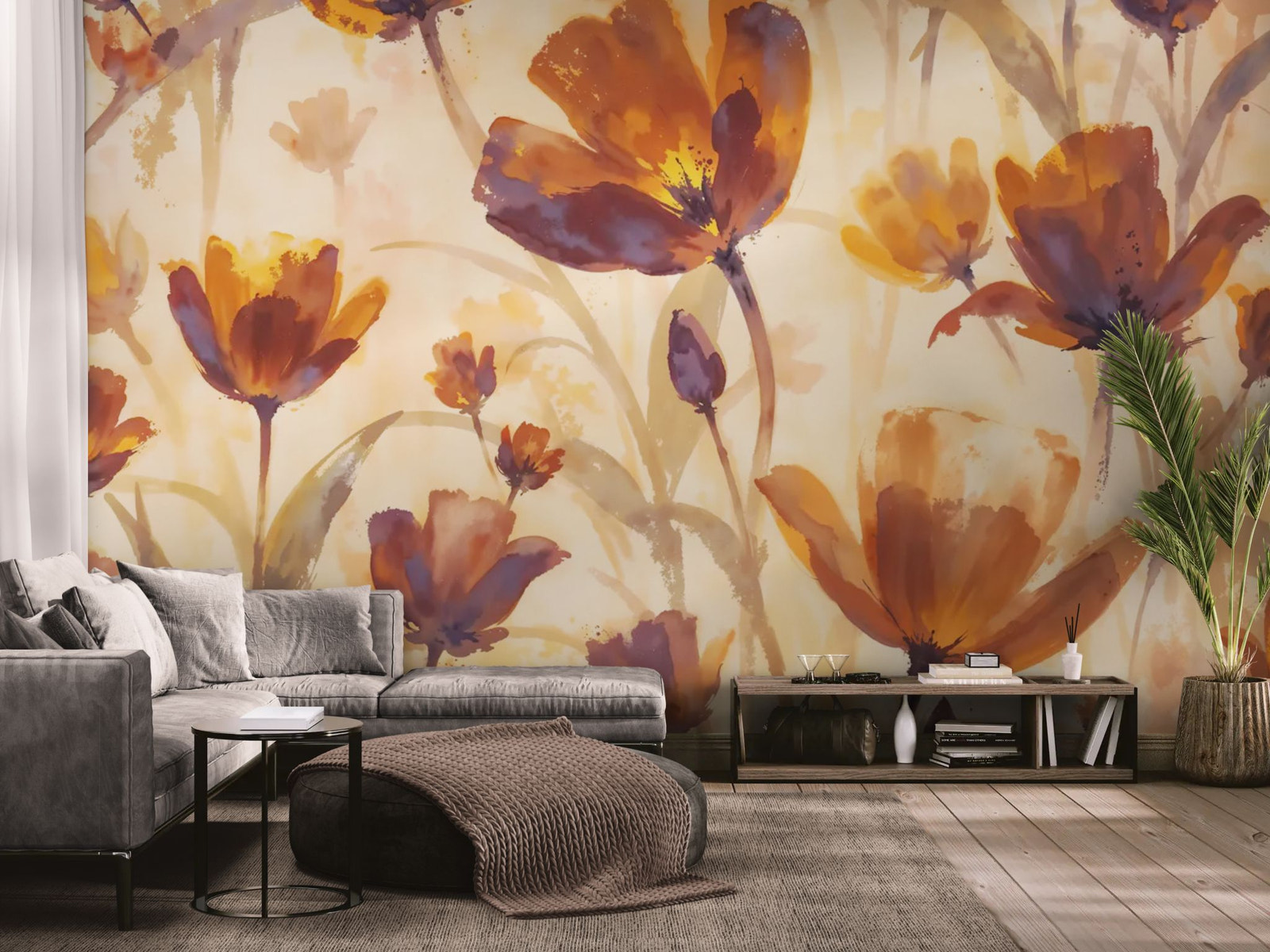 Delicate and floral. Envelop your room in warmth with this floral wallpaper . The delicate flowers stand out against a watercolor background in mocha and cream tones, creating a cozy and vintage atmosphere. This combination of botanical motifs and warm colors is ideal for a snug living room or master bedroom. A touch of elegant and comforting nature.