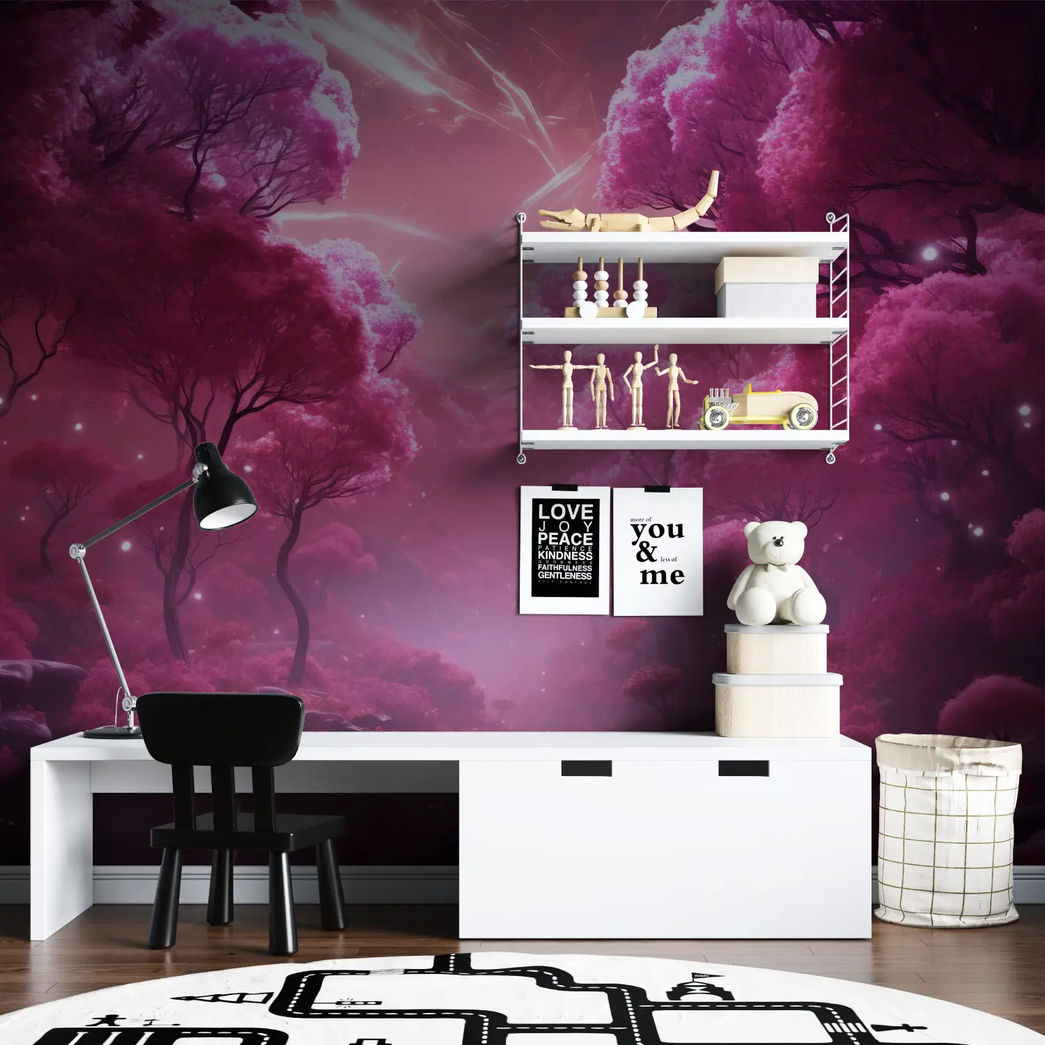 Step into the magic of an enchanted wood, where silhouettes of trees and foliage emerge in almost unreal shades. The meticulous printing brings out each plant curve, giving the landscape a magical character. A decorative choice conducive to dreaming, reminiscent of a fairytale forest, for a timeless interior.