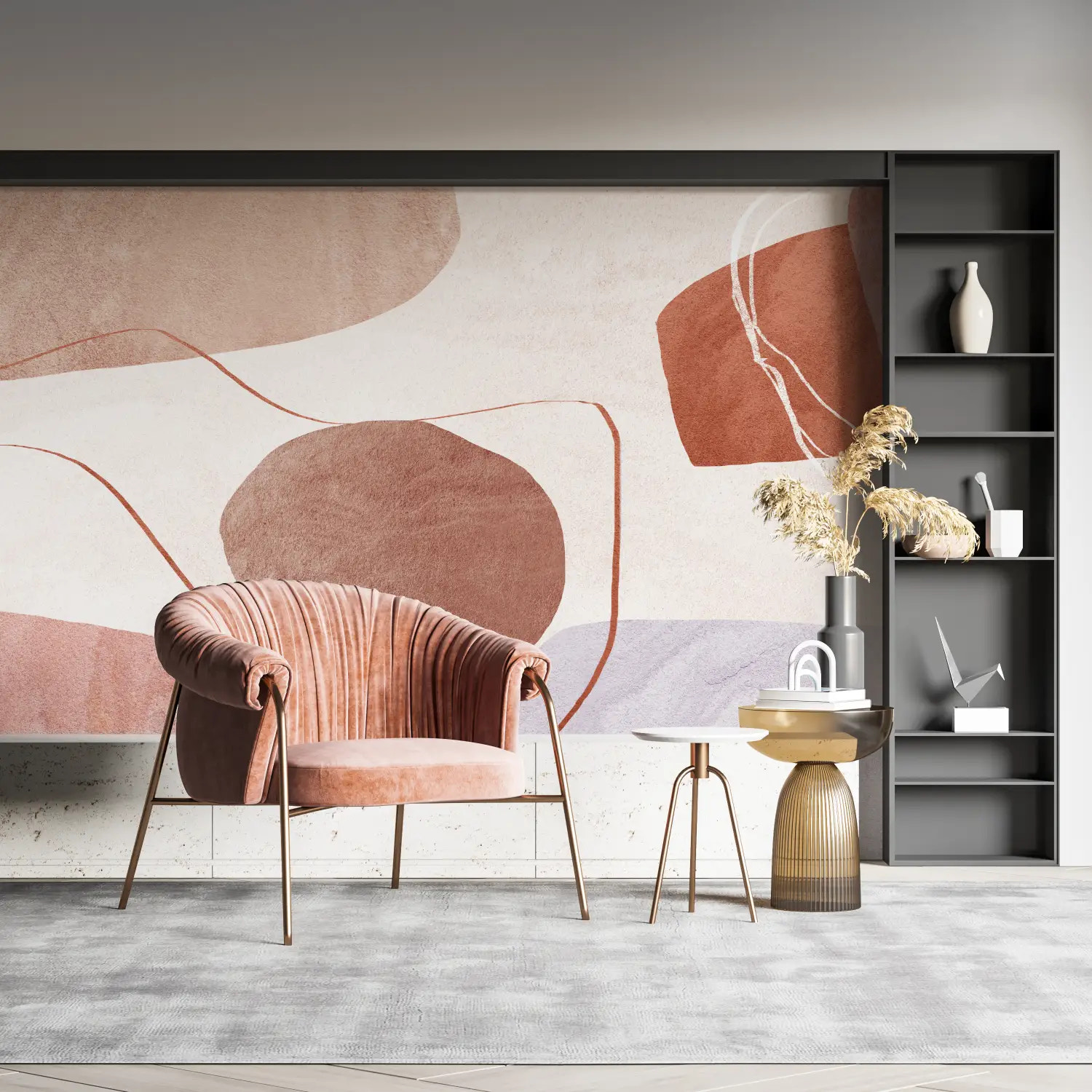 Opt for abstract pastel shapes, sometimes angular or rounded, in soft colors like pink, sea green, lavender… The print captures each nuance with fluidity, offering a soothing wall painting. A visual concept that is both modern and welcoming, ideal for softening a living space.