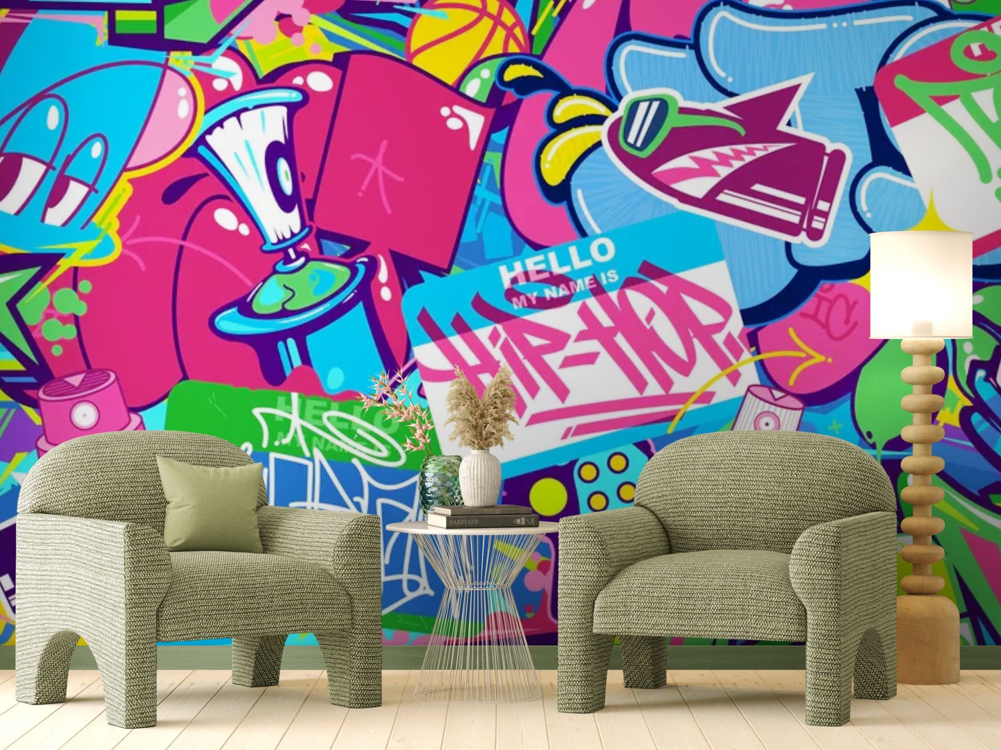 This graffiti wallpaper draws inspiration from the raw energy of contemporary street art. The intense colors instantly energize the room. Perfect for a bold, urban interior. Every detail adds character and modernity. A mural designed for lovers of daring decor.