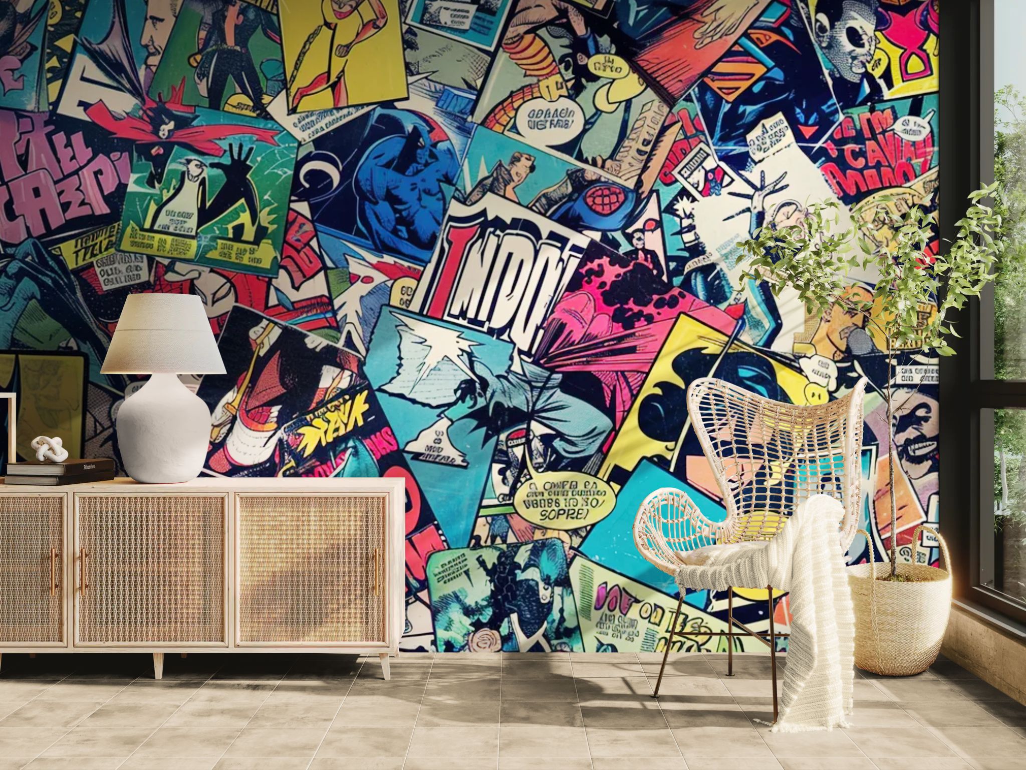 The history of superheroes in mosaic. Create a striking feature wall with this graphic wallpaper . The dense collage of vintage comic book covers and pages offers incredible visual richness for pop culture fans. Every detail tells a story. Ideal for adding a strong personality to an office, hallway, or teen bedroom.