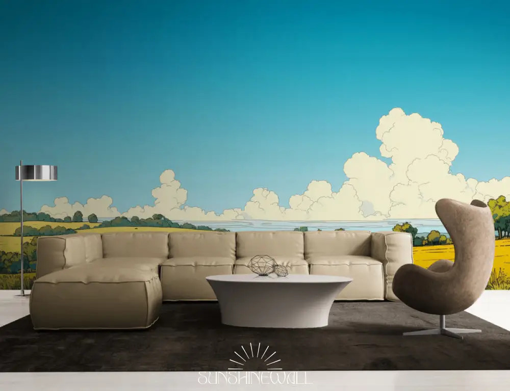 Invite rural tranquility with a glimpse of fields stretching as far as the eye can see, rendered in warm or pastel shades. The illustration reveals the simplicity and understated beauty of agricultural expanses, evoking a moment in time. A decor filled with serenity, perfect for an interior that loves the gentleness of the countryside.