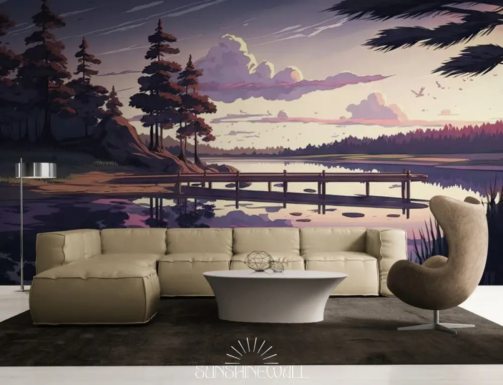Create a romantic scene with a pontoon extending into a lake or sea, under a purple sky, suggesting the magic of a rare twilight. The poetic illustration creates a timeless moment, imbued with softness. A perfect setting to cultivate the invitation to meditate by the water.