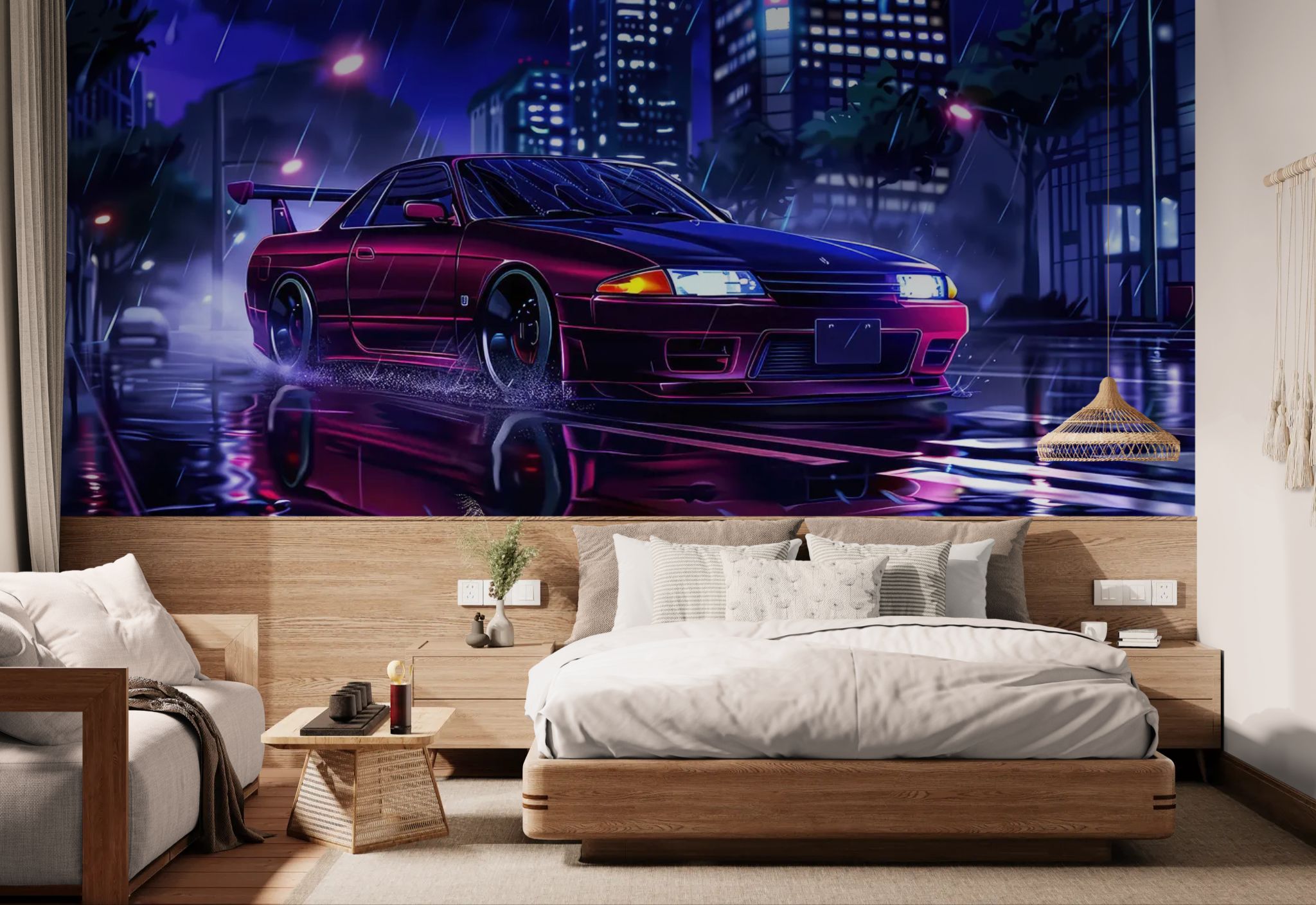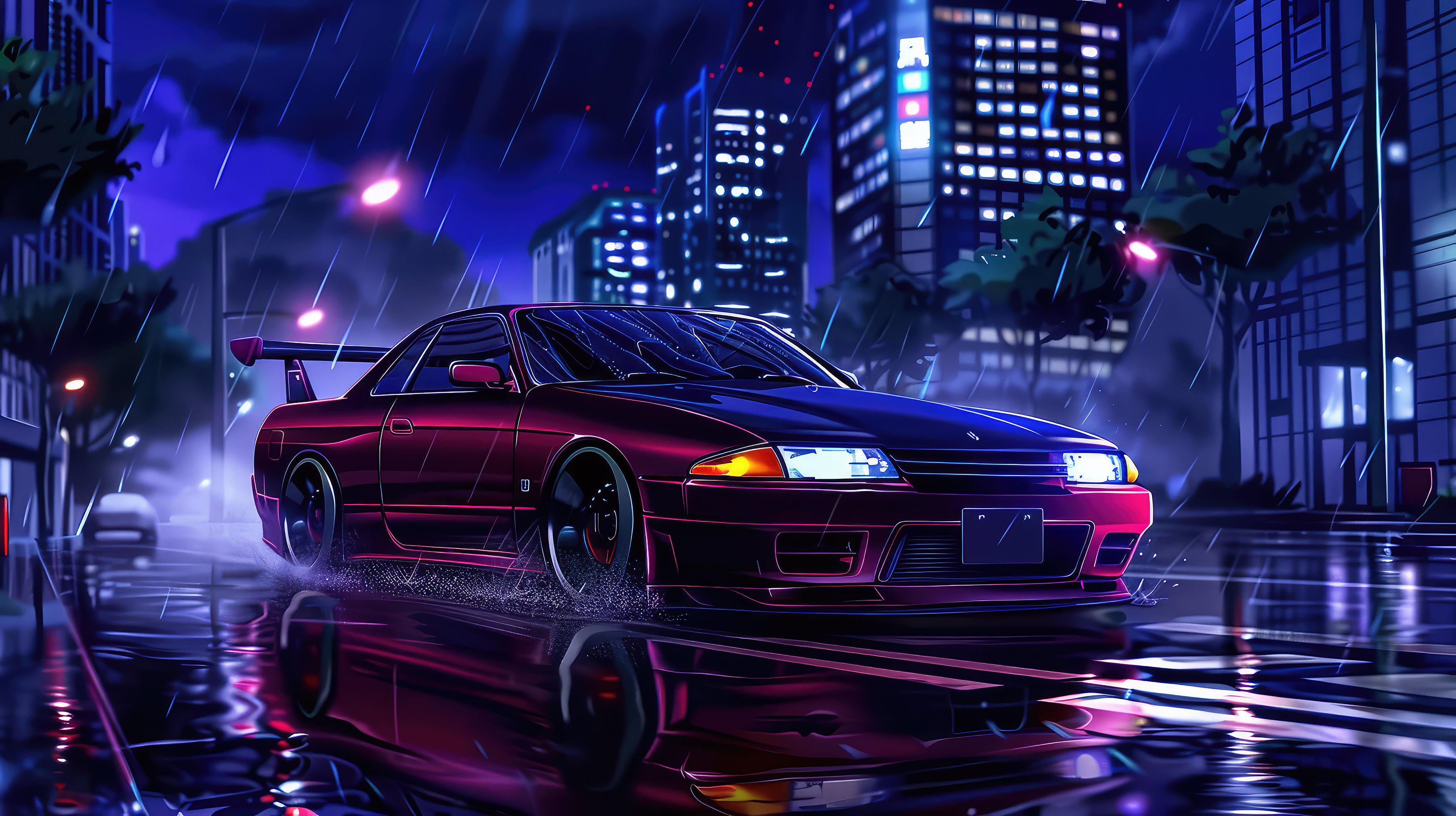 Drift culture at the heart of Tokyo. Celebrate Japanese automotive passion with this JDM (Japanese Domestic Market) wallpaper . The iconic sports car , staged in a rainstorm punctuated by neon lights, evokes Japan's legendary night races. This design combines technological aesthetics with a mysterious cyberpunk atmosphere. A centerpiece for enthusiasts of mechanics and modern Japanese culture, bringing character and dynamism to any room.