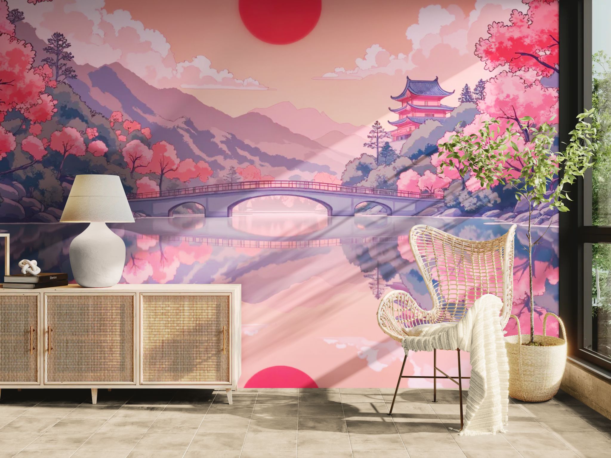 The harmony of eternal spring. Celebrate Japanese tradition with this Japanese wallpaper . The branch of cherry blossoms (Sakura) framing the view of an ancient temple offers a scene of absolute serenity. The delicate roses and wooden architecture bring elegance and tranquility. Perfect for a living room, bedroom, or wellness space seeking a refined cultural touch.