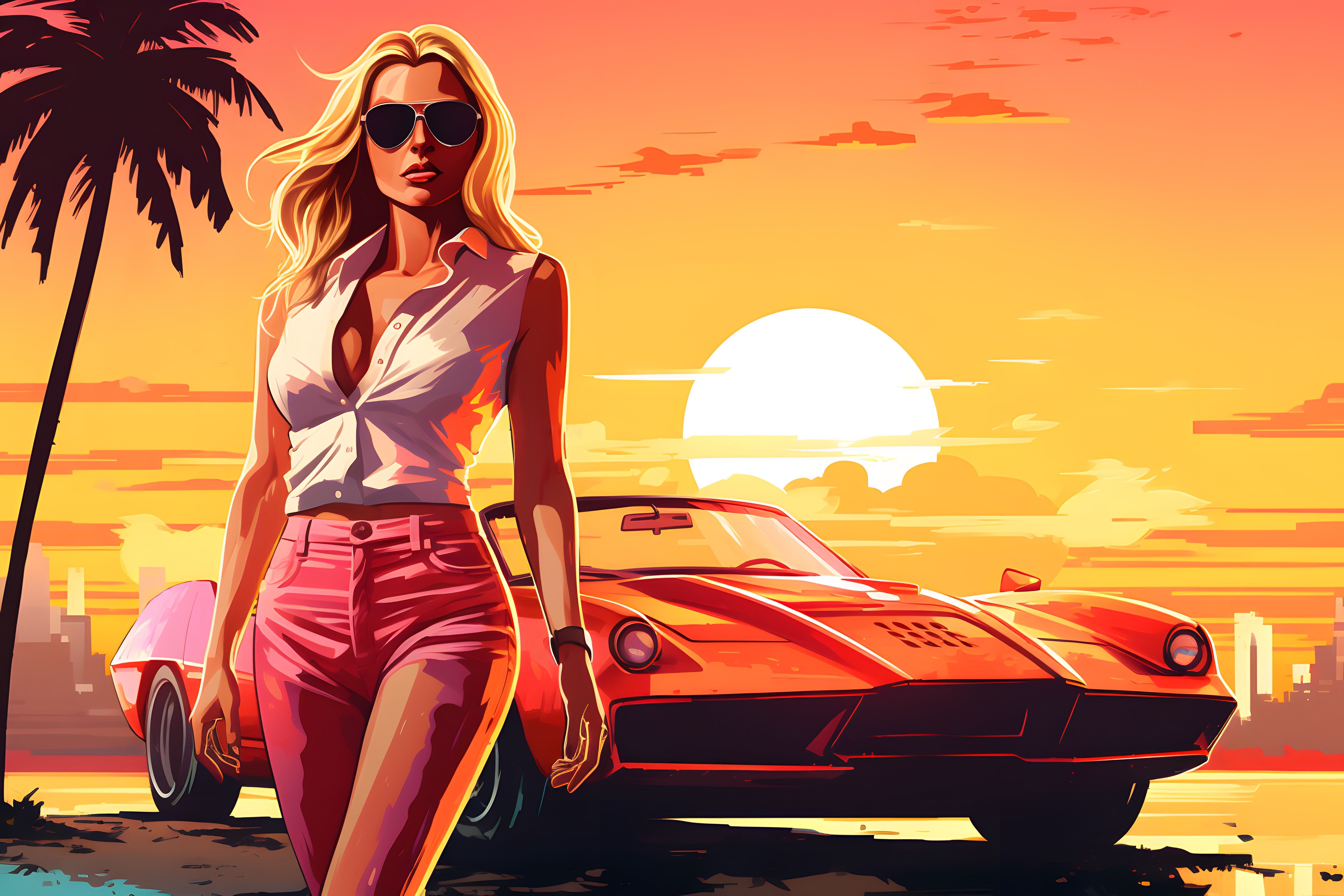 Une muscle car iconique se détache sous le ciel rose-orangé d’un coucher de soleil sur Miami, entre palmiers et néons océaniques. L’ambiance est libre, rétro et irrésistiblement estivale, idéale pour un salon moderne, un bureau créatif ou un espace gaming. Parfait pour ceux qui rêvent d’asphalte chaud, de vitesse et de nuits tropicales.