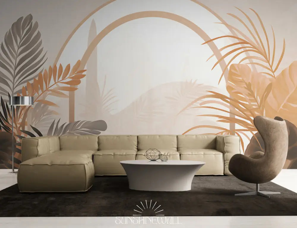 Combine a stylized arch or bow with autumnal foliage in shades of russet for a minimalist composition. The soft illustration suggests the season and geometry, creating a simple warmth.