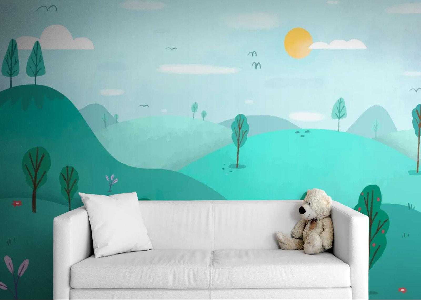 A soothing green horizon. Bring serenity into your home with this panoramic wallpaper . The gentle illustration of green hills offers relaxing depth and instant freshness. Rendered with a clean, minimalist style, this design visually expands the space. Perfect for a Zen office or bedroom, it creates an atmosphere of absolute well-being and connection with nature.