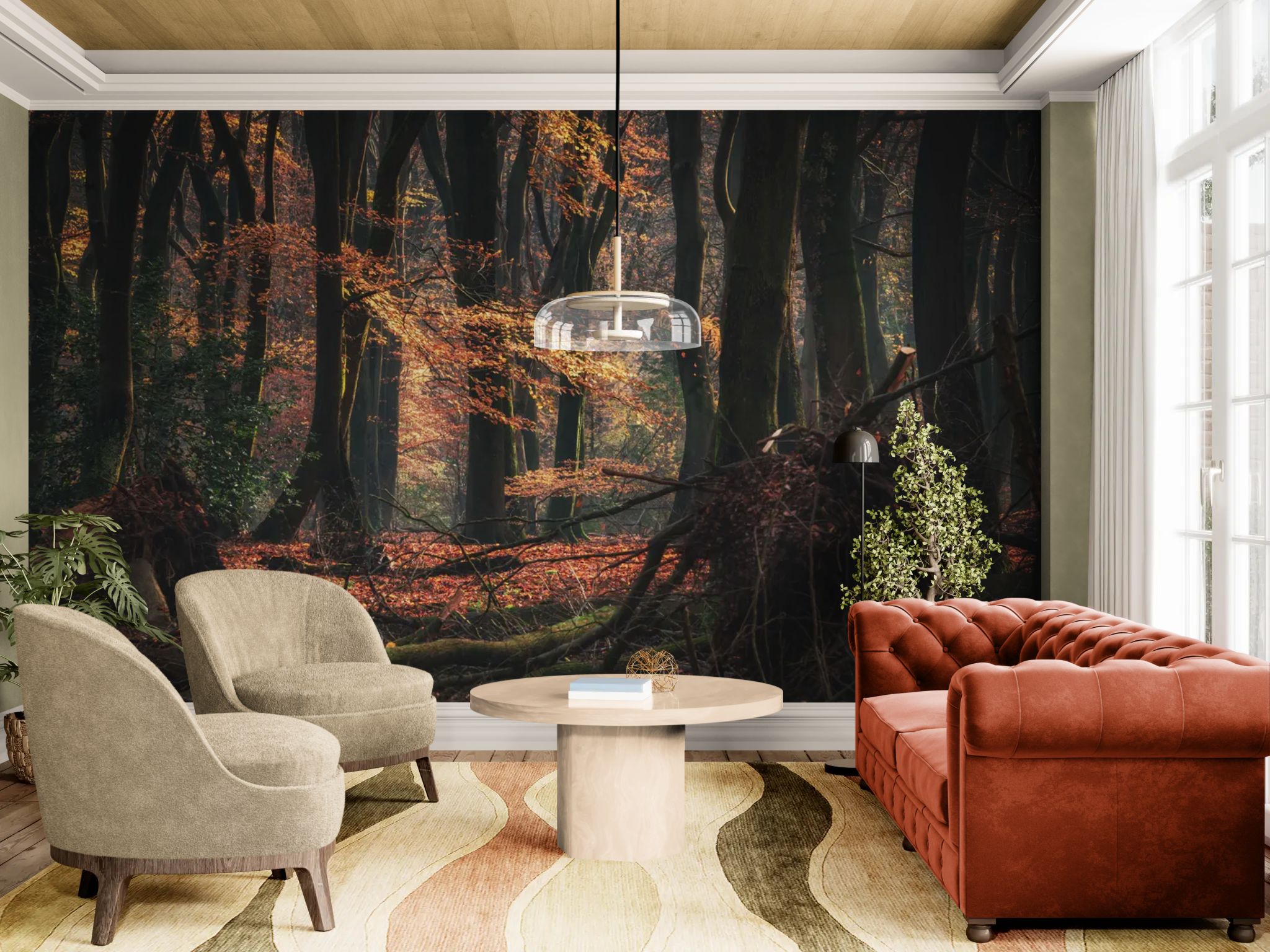 Dark romance and an enchanting atmosphere. Embrace dramatic elegance with this nature-inspired wallpaper . The depiction of a dark autumn forest , with its dead branches and carpet of russet leaves, creates a sophisticated, romantic gothic ambiance. The interplay of shadows and soft light adds a mysterious depth. Perfect for a bedroom or an intimate living room, this design appeals to lovers of moody aesthetics and wild nature.