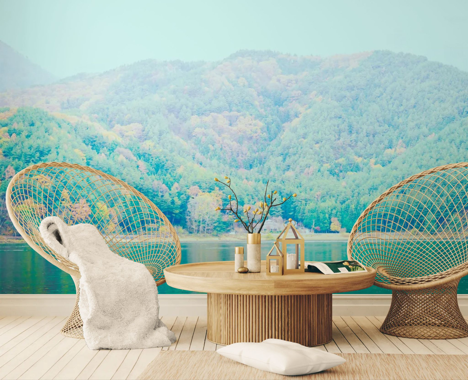 The soothing radiance of nature. Let the light in with this nature-inspired wallpaper . The view of a tranquil lake bordered by a luminous forest , where sunlight filters through the trees, creates an atmosphere of absolute serenity. This verdant and luminous design visually expands the space and invites deep relaxation.