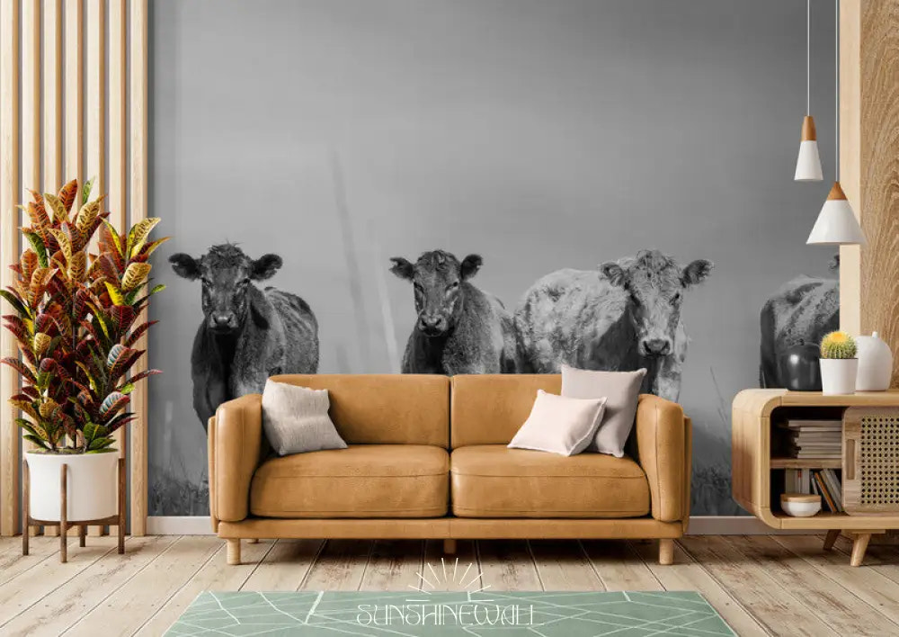 Draw inspiration from the ruggedness and gentleness of nature with this wallpaper featuring Highland cows in a peaceful landscape. Its intricate details and natural tones bring warmth and character to your walls, evoking an elegant and welcoming rural atmosphere.