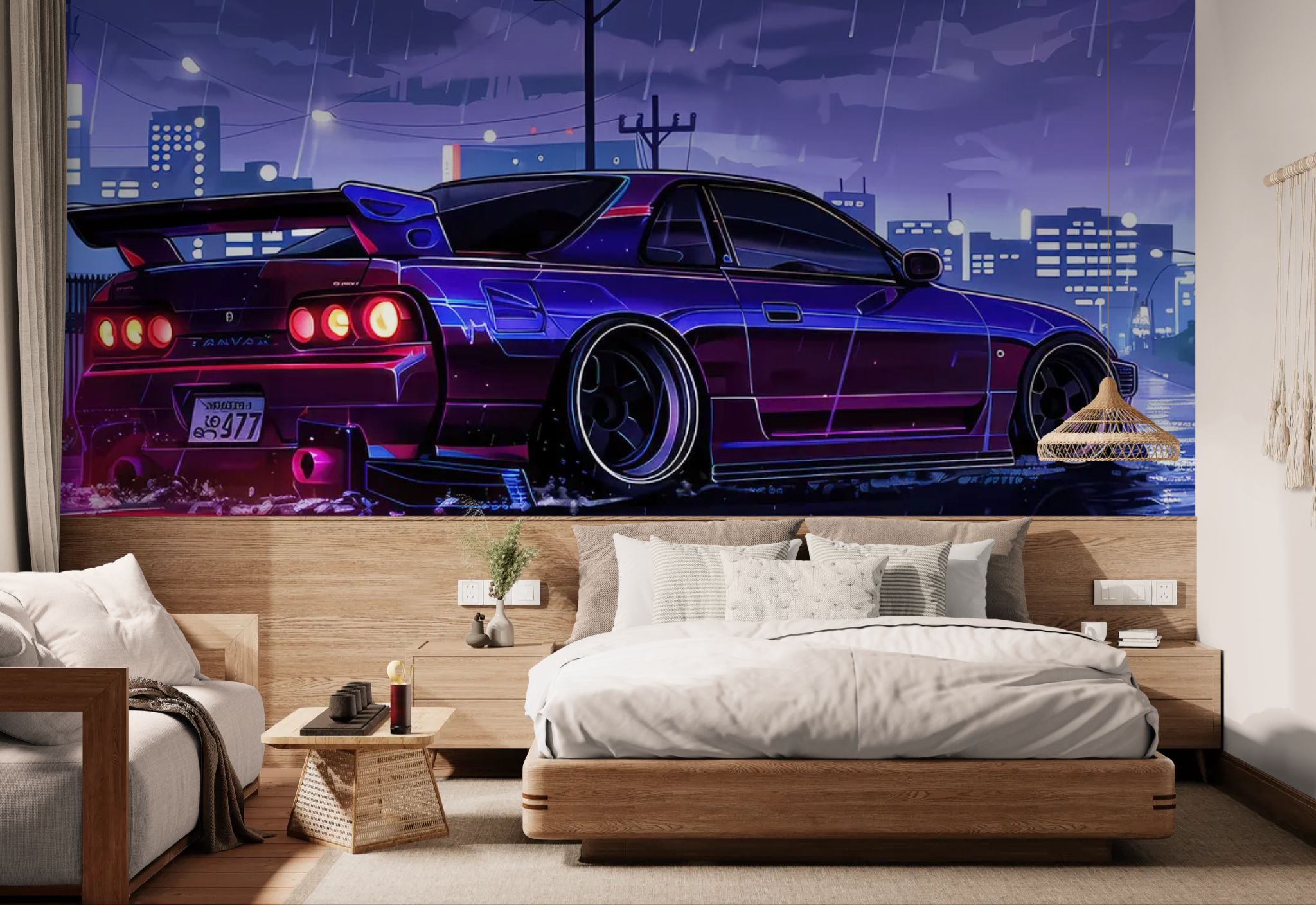 Electric urban vibes and reflections. Immerse yourself in the "Night City" aesthetic with this nocturnal wallpaper . The tuned car , enhanced by neon lights reflecting off the asphalt in the rain , creates an intense, cinematic atmosphere. The contrasts between darkness and bursts of colored light bring incredible depth. Ideal for a teen's bedroom, a playroom, or a modern space seeking a bold Street Racing style.