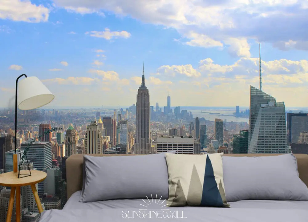 Invite the city into your home with this panoramic wallpaper featuring majestic skyscrapers rising from the clouds. Its play of perspective and contrasts creates a sense of height and space, bringing a chic urban feel to your decor.