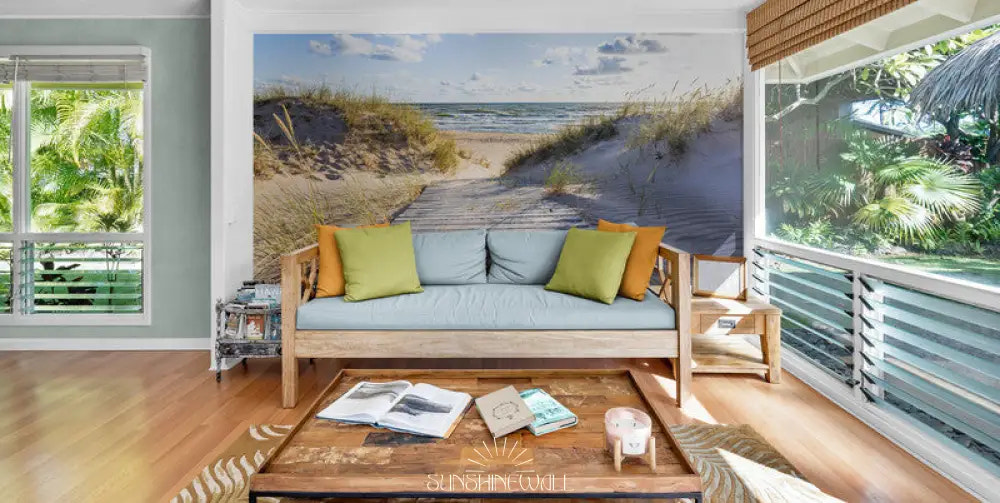 Treat yourself to a daily escape with this panoramic wallpaper depicting a peaceful seaside path. The subtle black and white tones create a relaxing atmosphere, inviting relaxation and contemplation, perfect for any living space.