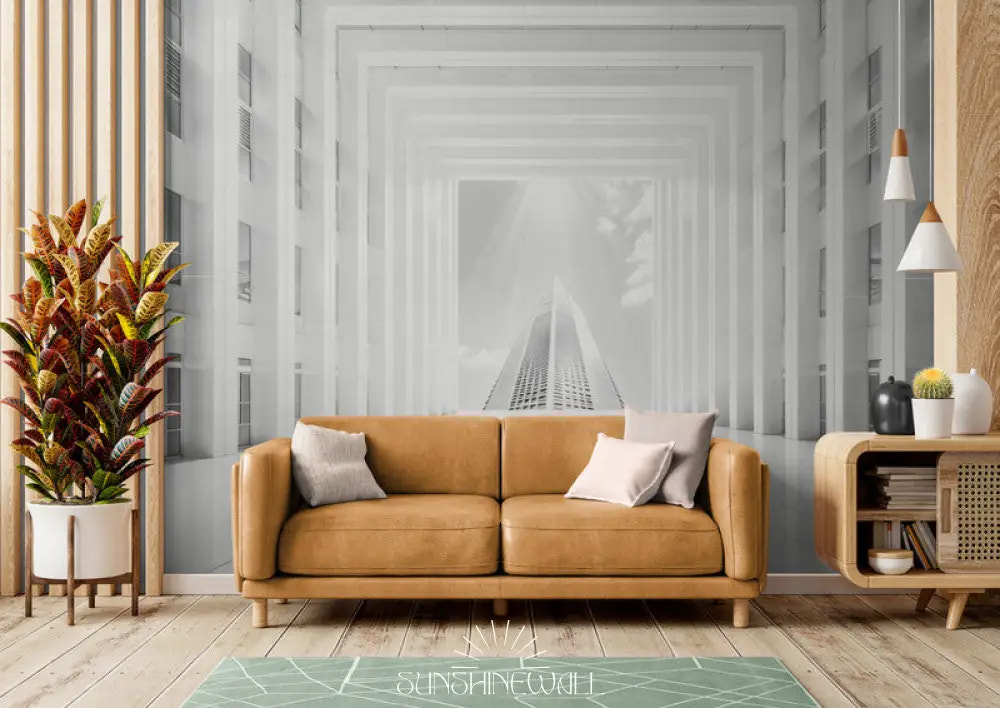 Bring brightness and depth to your home with this panoramic wallpaper depicting a white corridor extending toward a cloudy sky. This minimalist and airy design enhances modern spaces and creates a light and elegant ambiance.