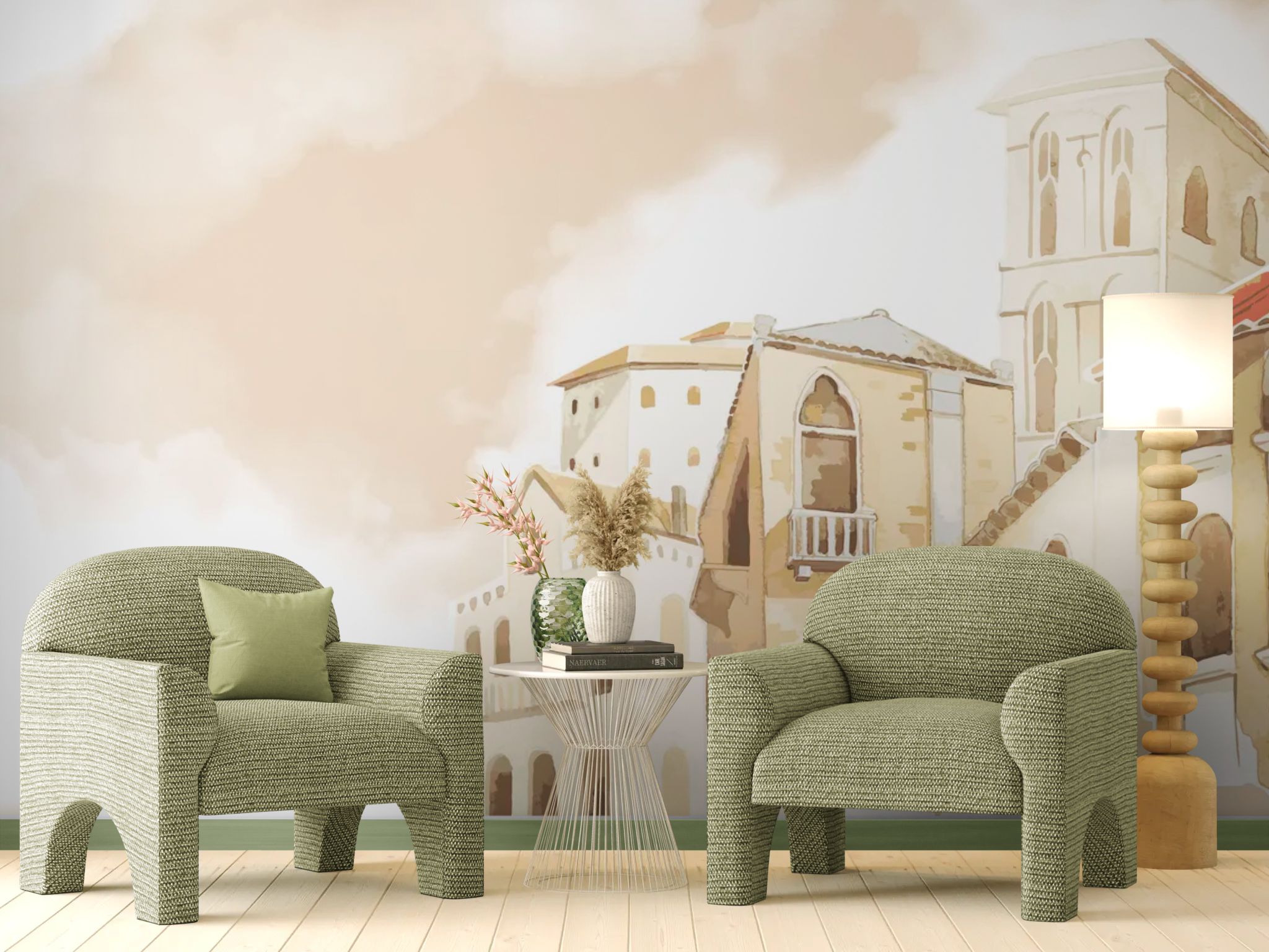 This landscape wallpaper showcases Mediterranean architecture with vintage charm. The muted tones evoke the authenticity and gentleness of the South. Ideal for creating a warm and luminous atmosphere, the design adds depth and a sense of escape—an invitation to travel in refined style.