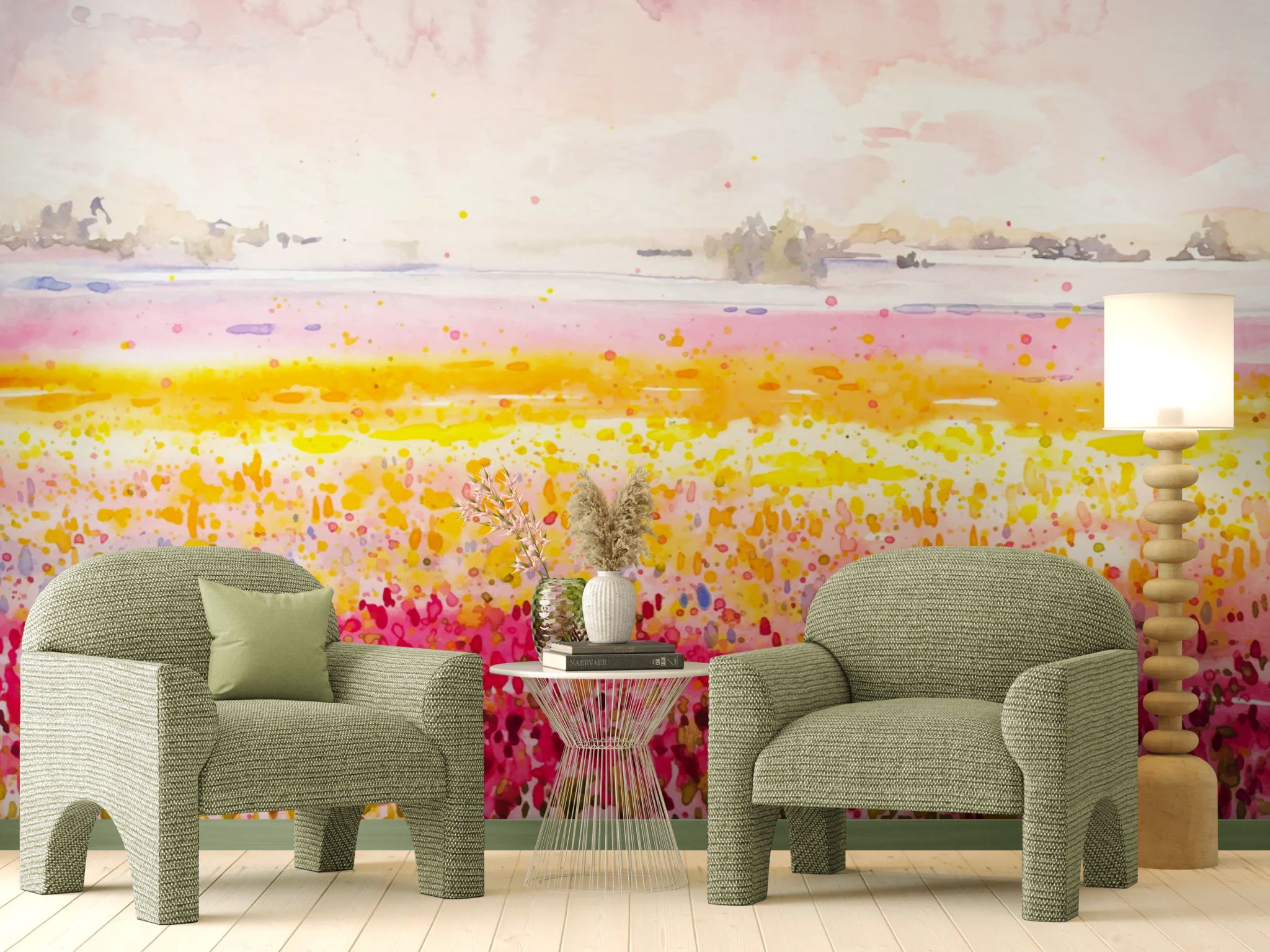 A watercolor painting of a flowery field stretches lightly across the walls. The luminous colors infuse the space with freshness and serenity. Ideal for creating a natural and soothing atmosphere. The delicate details add depth and movement. An invitation to contemplation.