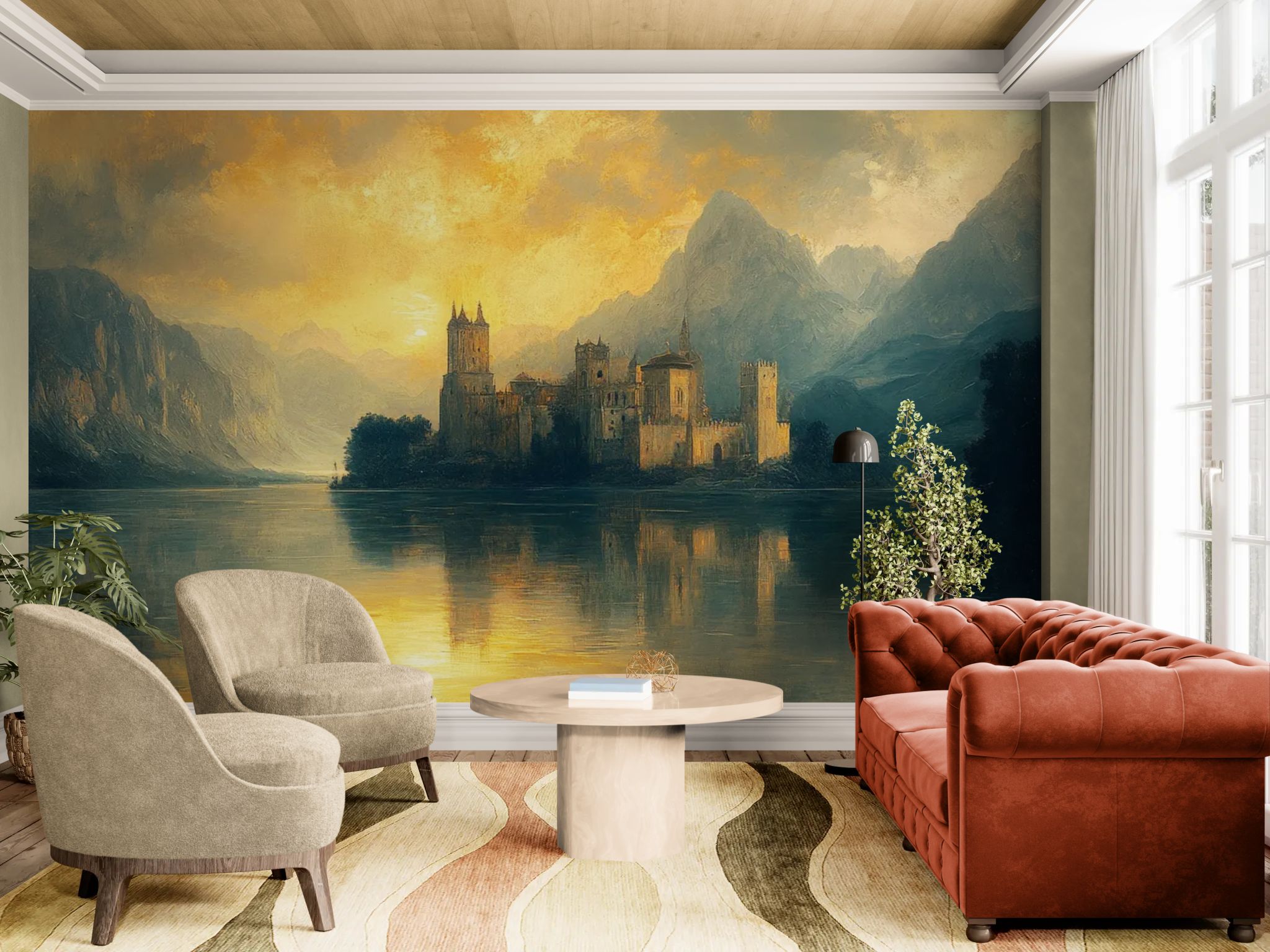 A fairytale at dusk. Bring a touch of regal magic to your décor with this castle wallpaper . Bathed in the golden light of a sunset , the fairytale architecture stands out elegantly, evoking legends and dreams. The warm hues of gold and amber create a cozy atmosphere, making this wallcovering the perfect choice for a romantic bedroom or an inspiring playroom. An invitation to a journey into the imagination.