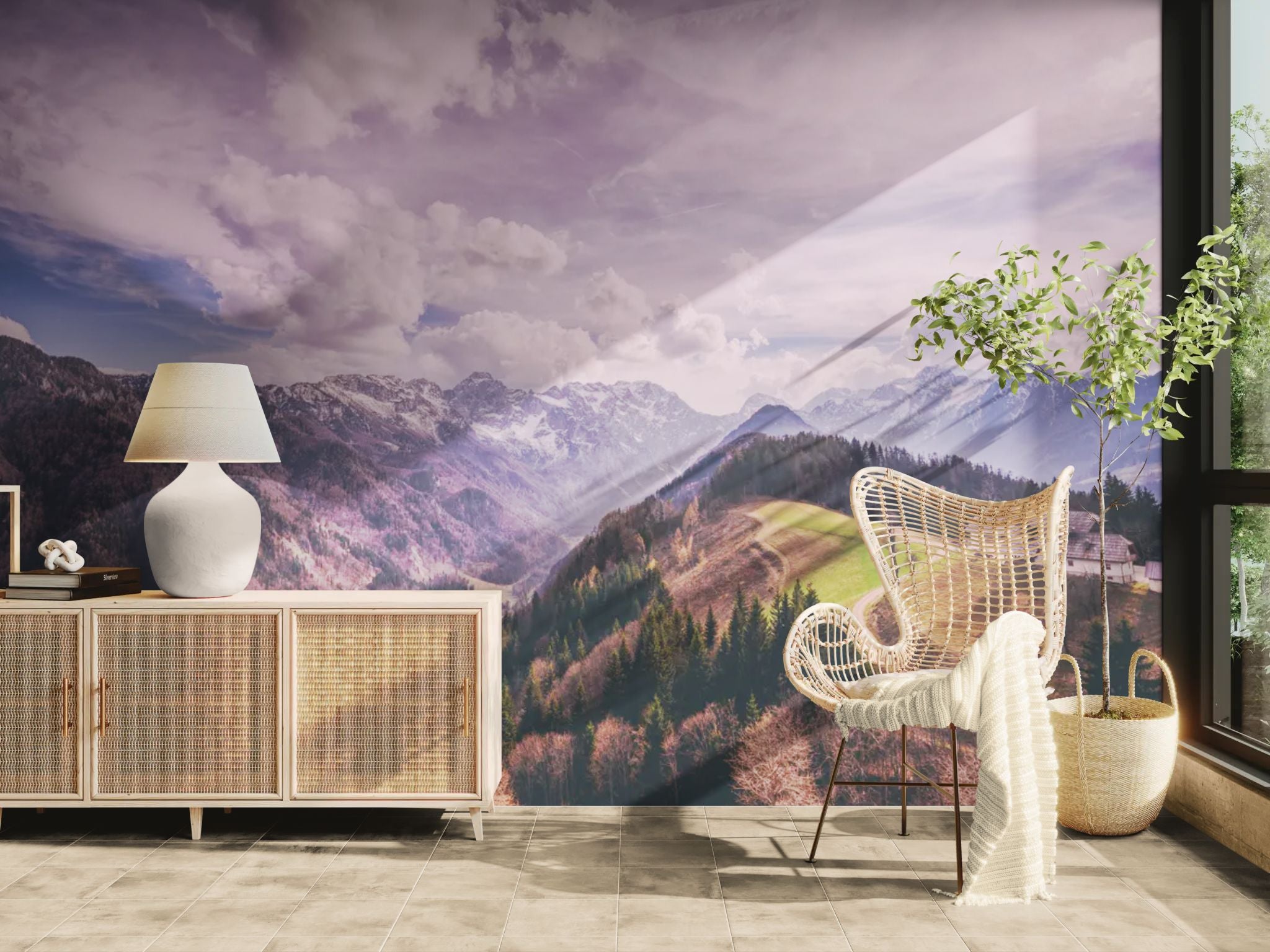 The call of the peaks and pastoral life. Rediscover authenticity with this landscape wallpaper . The winding mountain path leading the eye to a secluded farmhouse nestled in the heart of the mountains creates a peaceful and rustic visual narrative. This design evokes the fresh air and soothing silence of the high altitudes. Ideal for adding a touch of "chalet chic" to a living room or for a bedroom seeking absolute serenity.