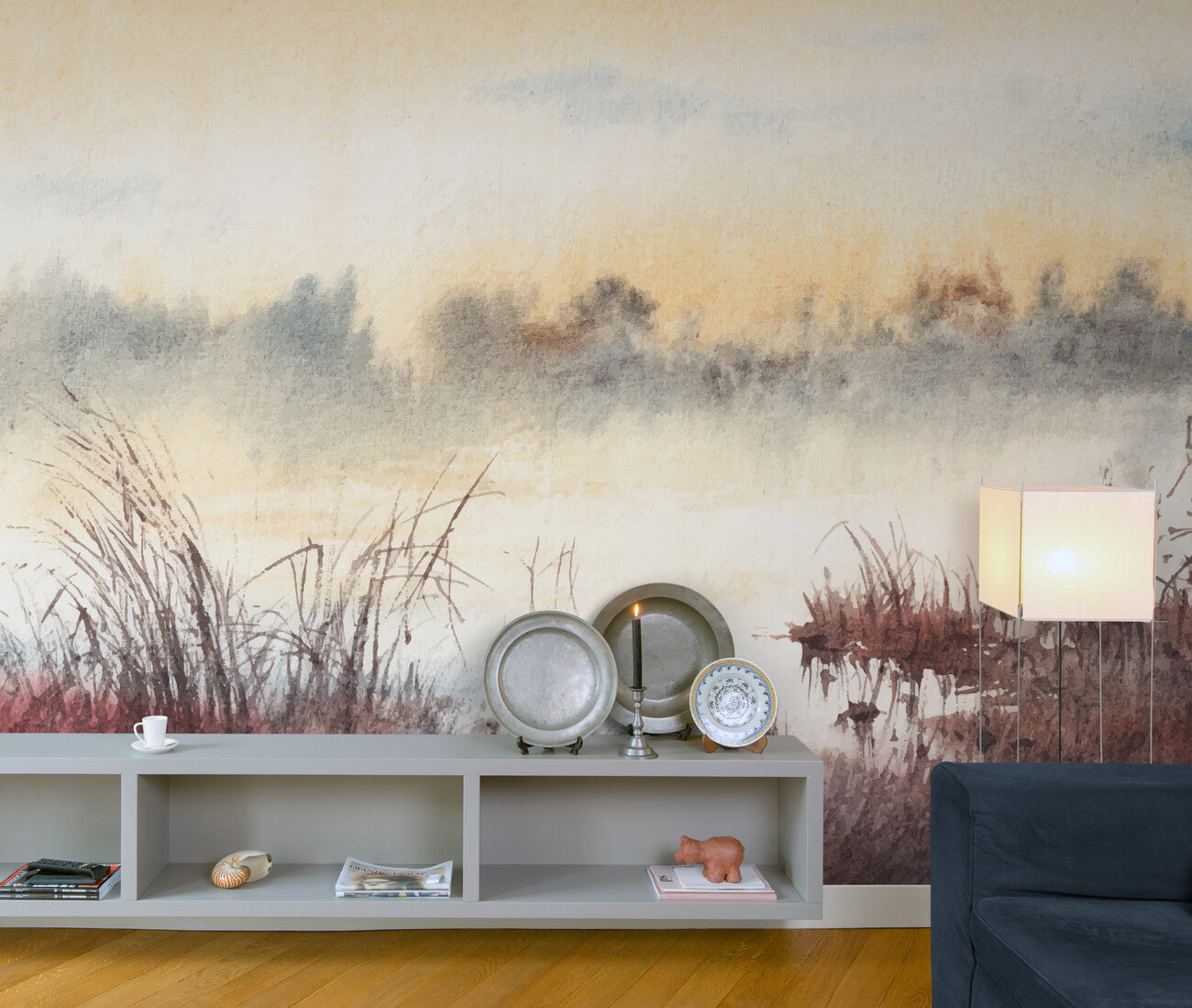 Add a poetic and mysterious touch to your interior with this panoramic wallpaper depicting a lake shrouded in a delicate mist. The soft shades of blue and gray create a relaxing ambiance, ideal for a cozy living room or bedroom. This elegant decor invites daily escape and meditation. Its high-end quality guarantees a perfect and lasting visual rendering. Let yourself be transported every day by this subtle natural landscape, bringing calm and elegance to your space. An ideal decoration for lovers of soft and soothing atmospheres.