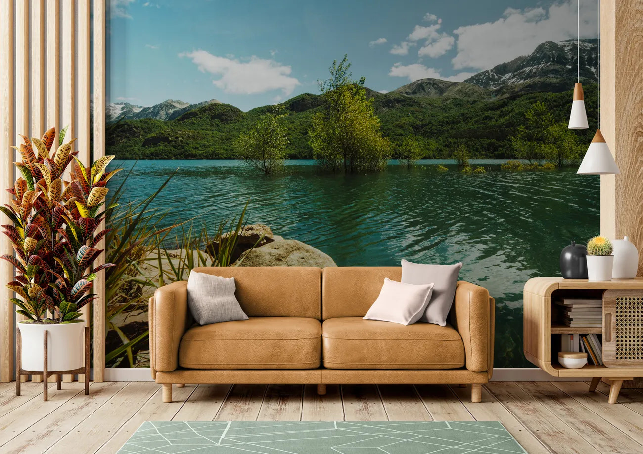 Enhance your space with the incomparable beauty of an emerald lake surrounded by majestic mountains with this panoramic wallpaper. The deep green hues of the lake combined with the towering peaks create an atmosphere that is both calming and grandiose. This natural and elegant decor is perfect for a living room, bedroom, or relaxation area. Its exceptional quality guarantees a realistic and durable finish. Every day, enjoy a spectacular and refined view, ideal for creating a naturally chic ambiance. A daily invitation to contemplate a sumptuous landscape in your home.