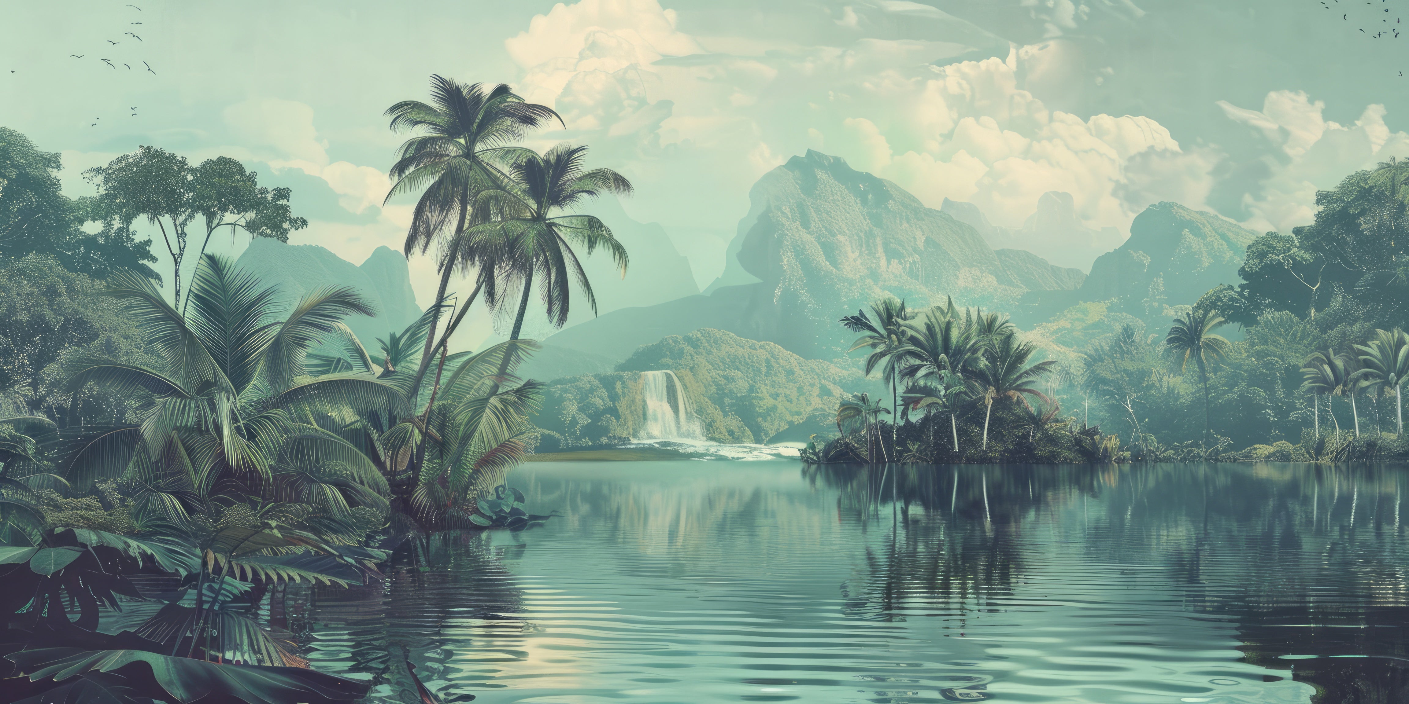 Tropical serenity and ethereal mystery. Create an oasis of calm with this landscape wallpaper . The tropical lake , enveloped in a tranquil morning mist, offers a zen and refreshing ambiance. The lush vegetation in the background suggests unspoiled nature. Perfect for transforming a bathroom or living room into a sanctuary of relaxation.
