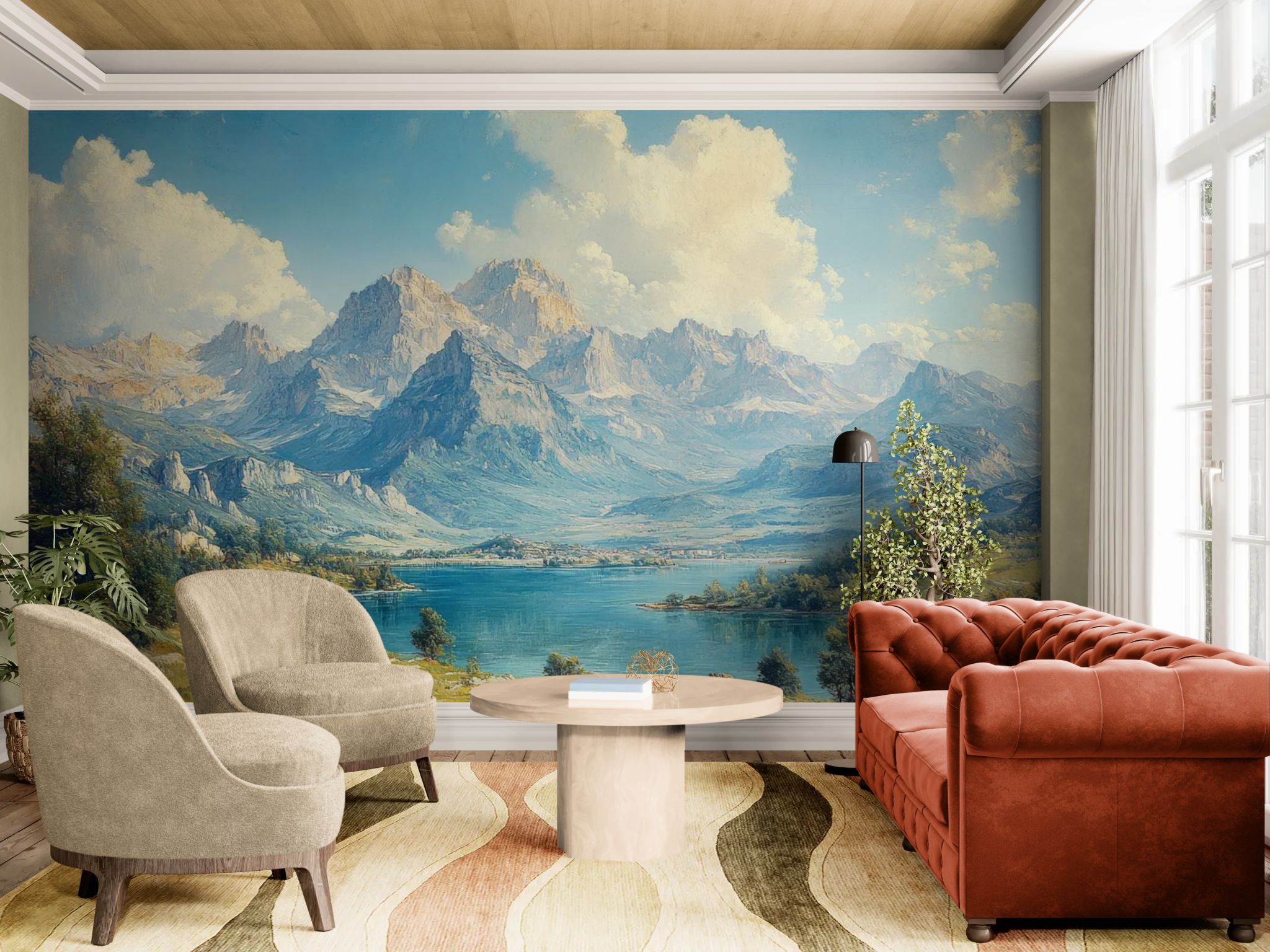 Alpine serenity and natural grandeur. Transform your interior into a peaceful retreat with this mountain landscape wallpaper . The breathtaking view of majestic peaks reflected in a calm blue lake brings immediate depth and freshness. This high-definition panoramic design captures the purity of the mountain air, ideal for visually expanding a living room or creating a zen atmosphere in an office.