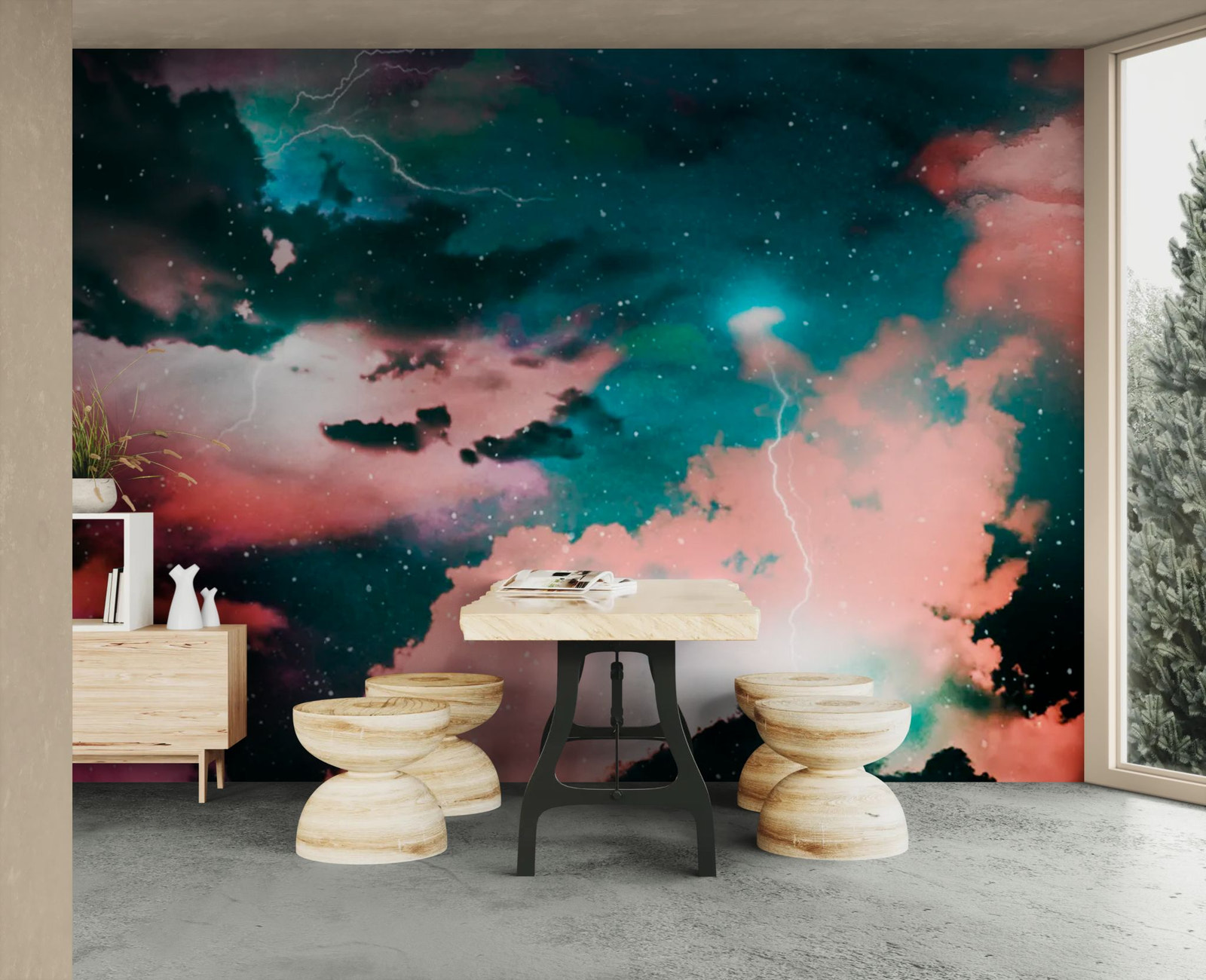 The vibrant energy of the cosmos. Electrify your décor with this space landscape wallpaper . Cosmic clouds charged with electrical energy (blue, purple, neon) offer a mesmerizing visual spectacle. This intense and modern design brings a galactic depth. Perfect for a teen's bedroom or a gaming room.