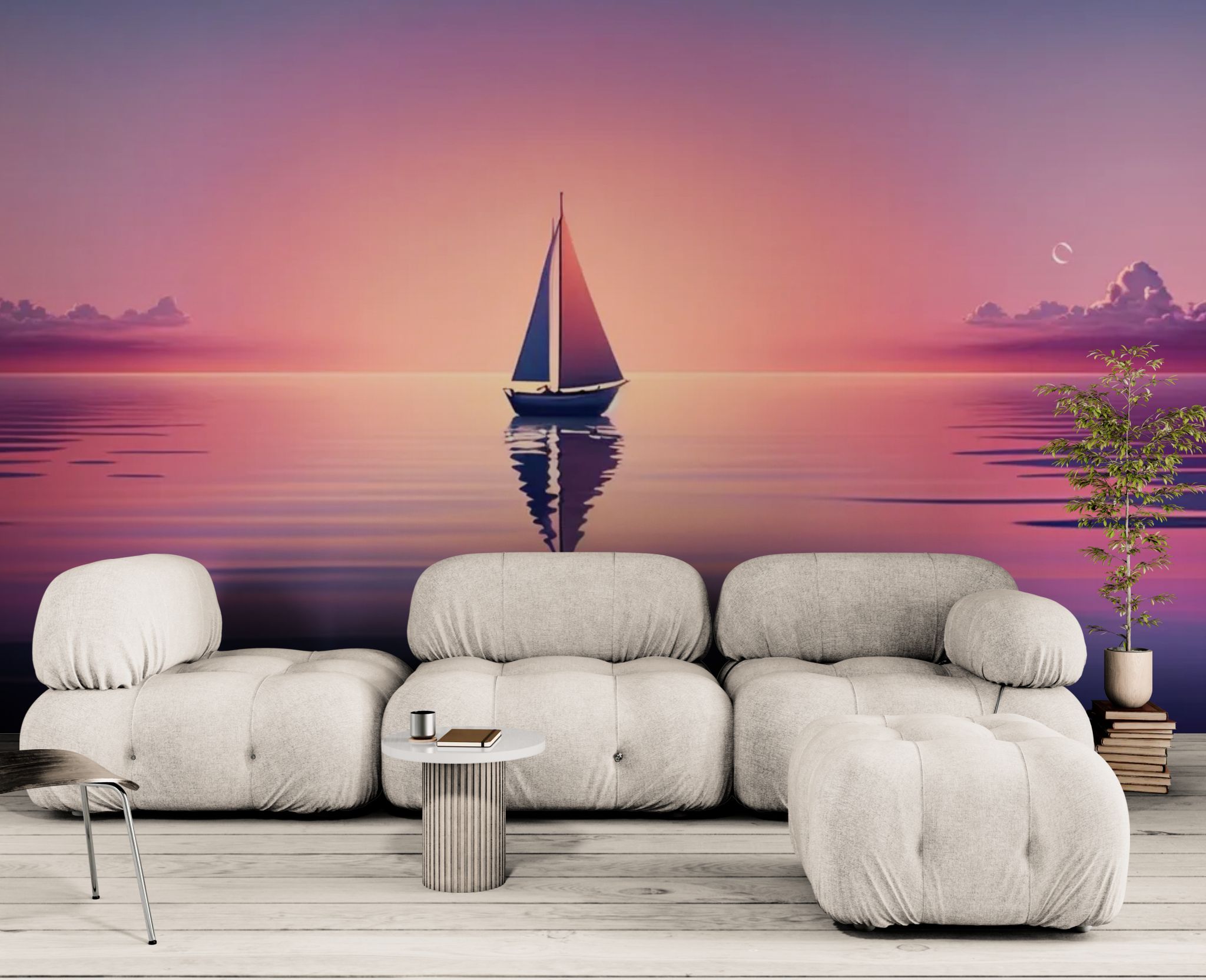 Absolute serenity at sunset. Create a calming atmosphere with this seascape wallpaper . The silhouette of a sailboat against a horizon bathed in a violet sunset invites contemplation. The subtle shades of mauve create a chic twilight ambiance, perfect for a bedroom. A true invitation to travel, combining gentle melancholy with panoramic elegance.