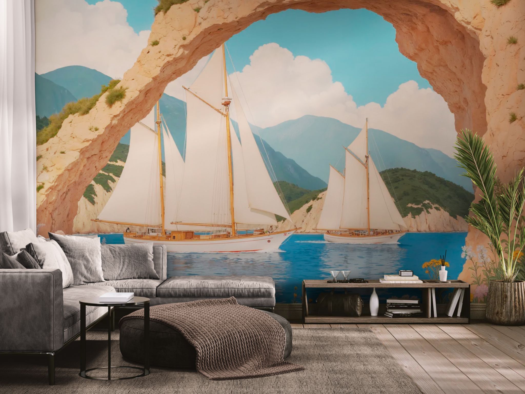 A breathtaking escape into the heart of the rock. Open your interior to the horizon with this seascape wallpaper . The spectacular view of sailboats gliding peacefully beneath a majestic rock arch creates a striking depth of field. This natural, light-filled scene brings an immediate sense of freedom and adventure. A statement piece to visually enlarge a living room or invite a sense of travel into an office.